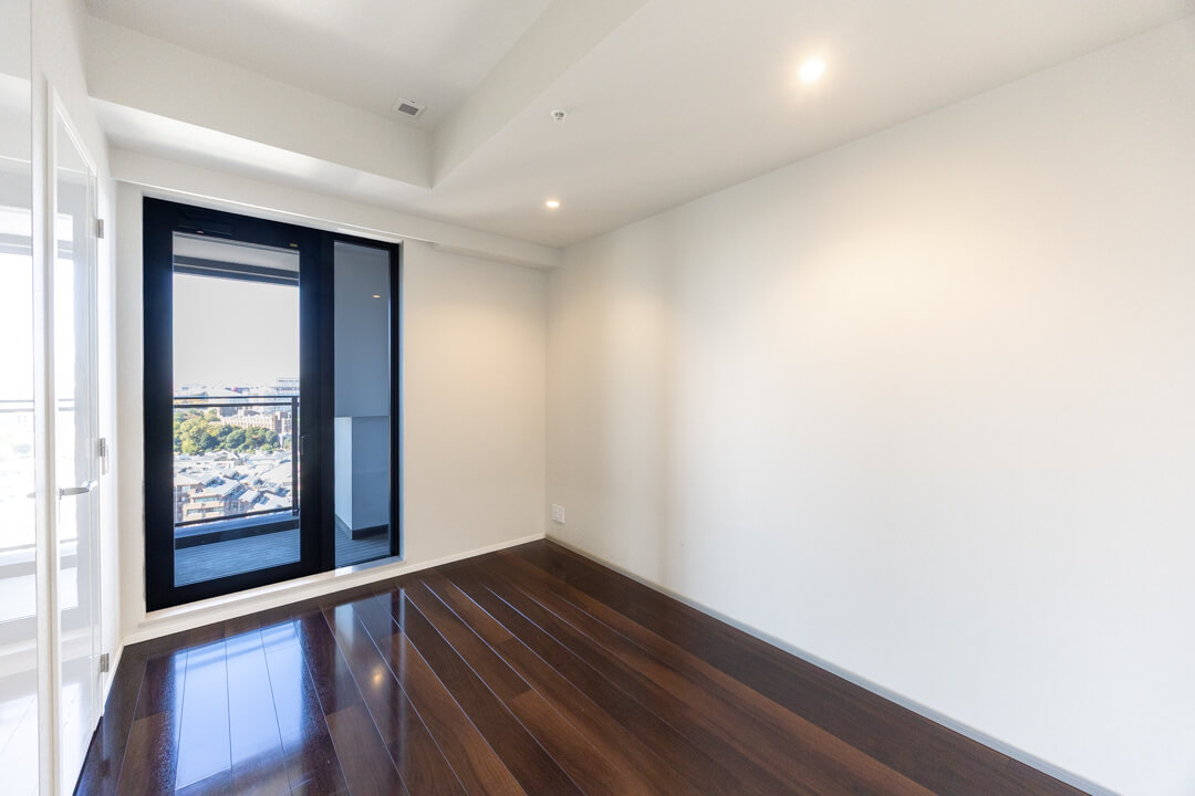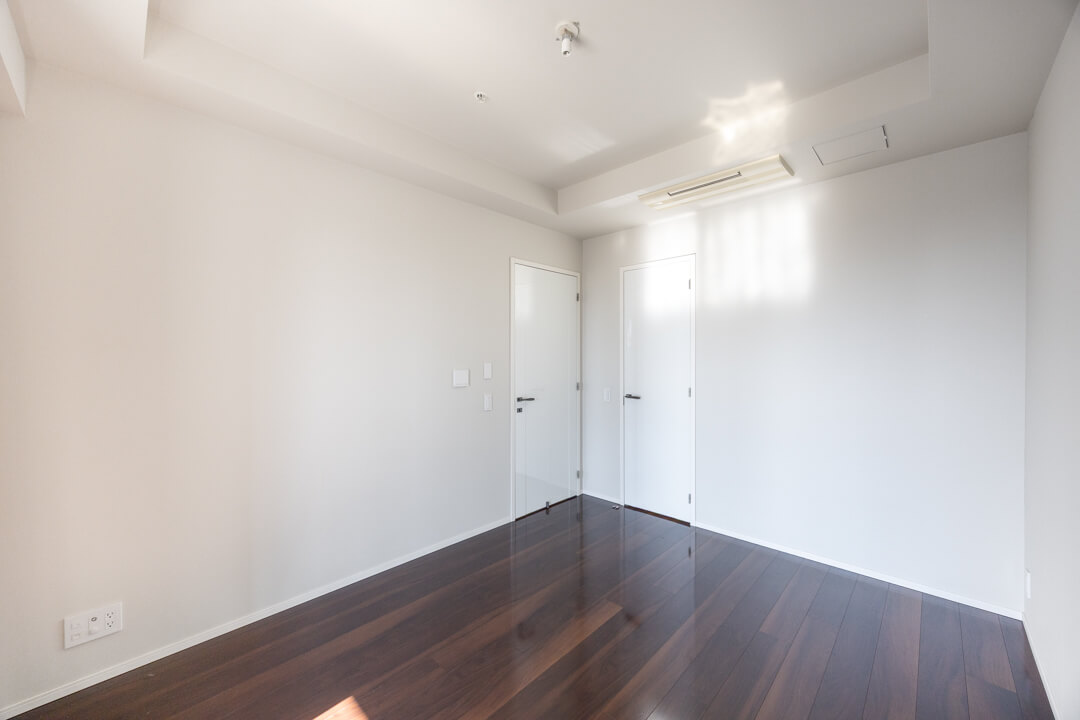 約7.3帖の寝室1。南向きバルコニーに面していて、明るい光がたっぷり差し込みます。リビング同様に床暖房が敷設されていて、寒い時期も快適に過ごすことができます。主寝室にぴったりの空間です。