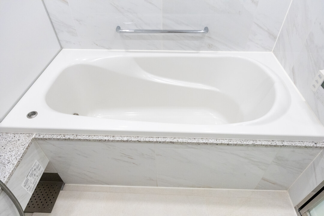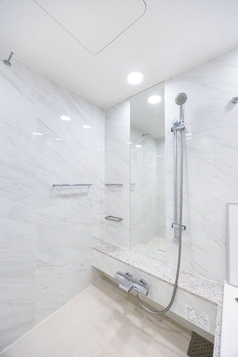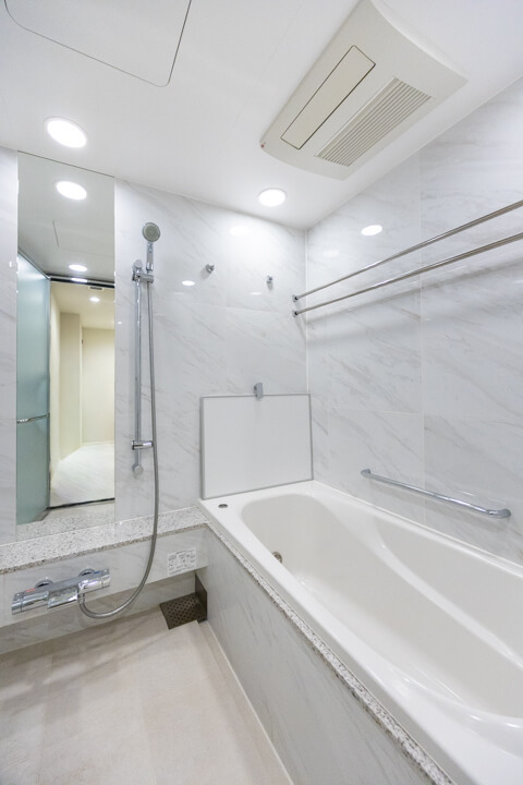 石調デザインで高級感の漂うバスルーム。換気・暖房・乾燥・涼風機能付きで1年中快適なバスタイムを過ごせます。追い焚き機能も付いているので、家族の入浴時間がずれてしまった時、半身浴をしたい時に便利です。