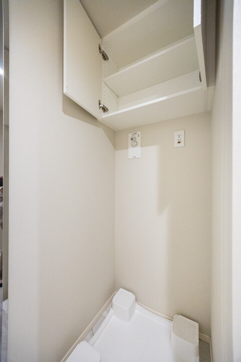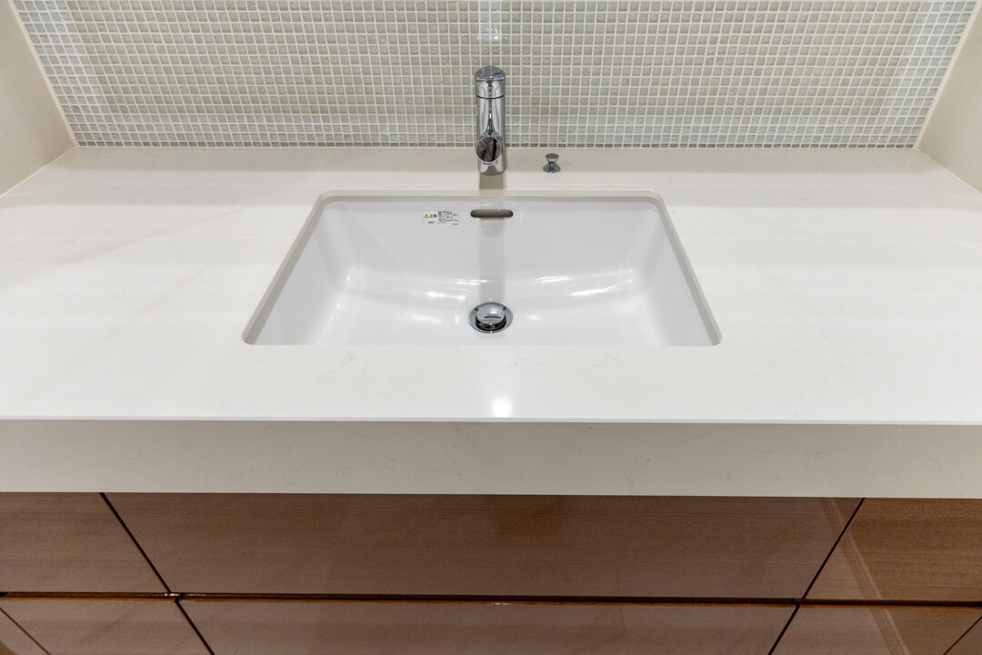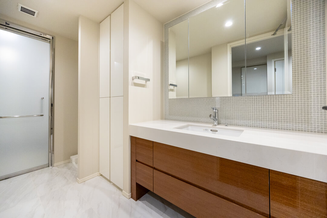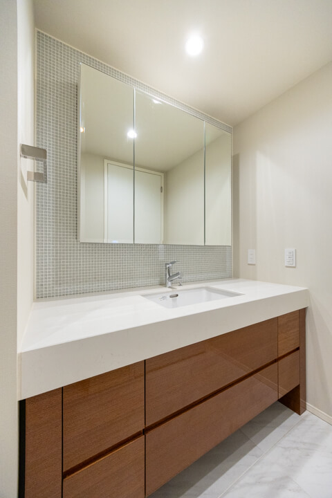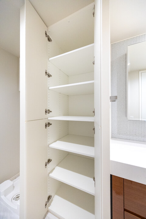 カウンタースペースが広く、ホテルライクな洗面化粧台。化粧品やドライヤーの仮置きができ、忙しい朝の身支度を落ち着いて行えそうです。洗面台本体の収納に加え、左手には収納力のあるリネン庫を設置。タオルやパジャマ、洗剤などをすっきり収納できます。