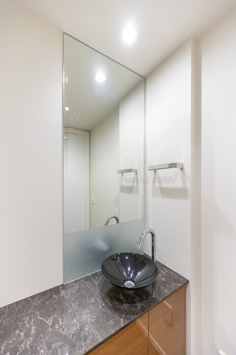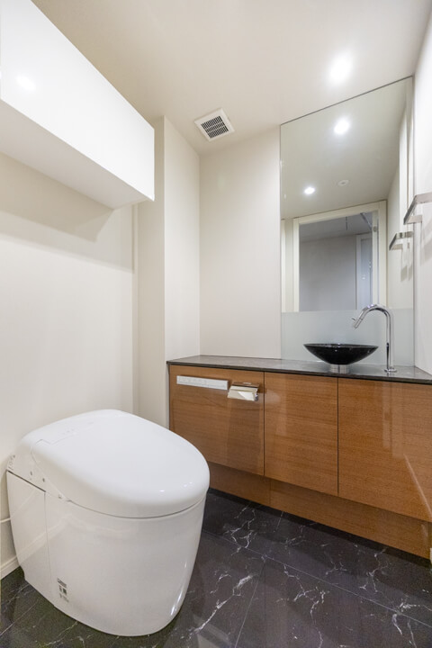 廊下に面していて独立性の高いレストルーム。丸みを帯びたタンクレストイレがスタイリッシュな印象です。手洗いカウンター付きなので、すぐに手を洗うことができて衛生的。ゲストを洗面室まで案内する手間もかかりません。人感センサー搭載で、電気の消し忘れがないのも嬉しいポイントです。
