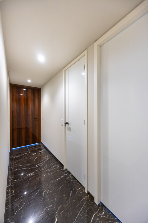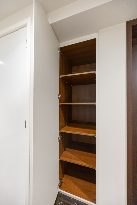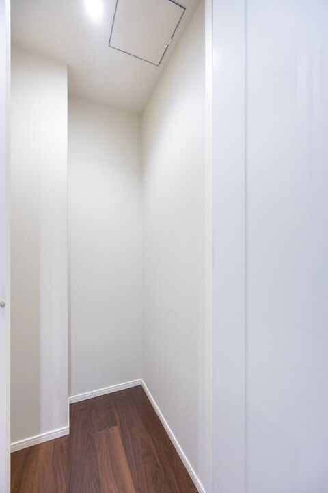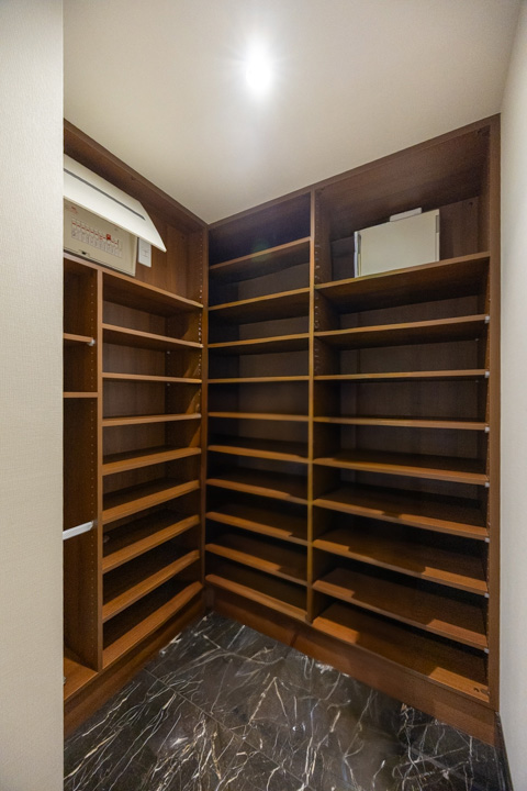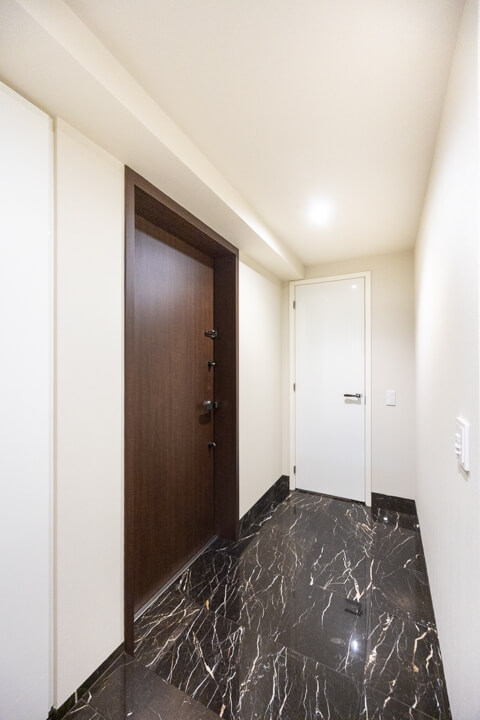 石柄フロアで高級感の漂う玄関・廊下。玄関に入って左手にはSIC(シューズインクローゼット)を完備しています。自由度の高い可動棚で、ロングブーツや傘などもすっきり収納可能。いつも清潔な玄関でお出迎えができそうです。廊下収納も充実していて、日用品ストックや掃除機、季節家電などの収納に便利です。