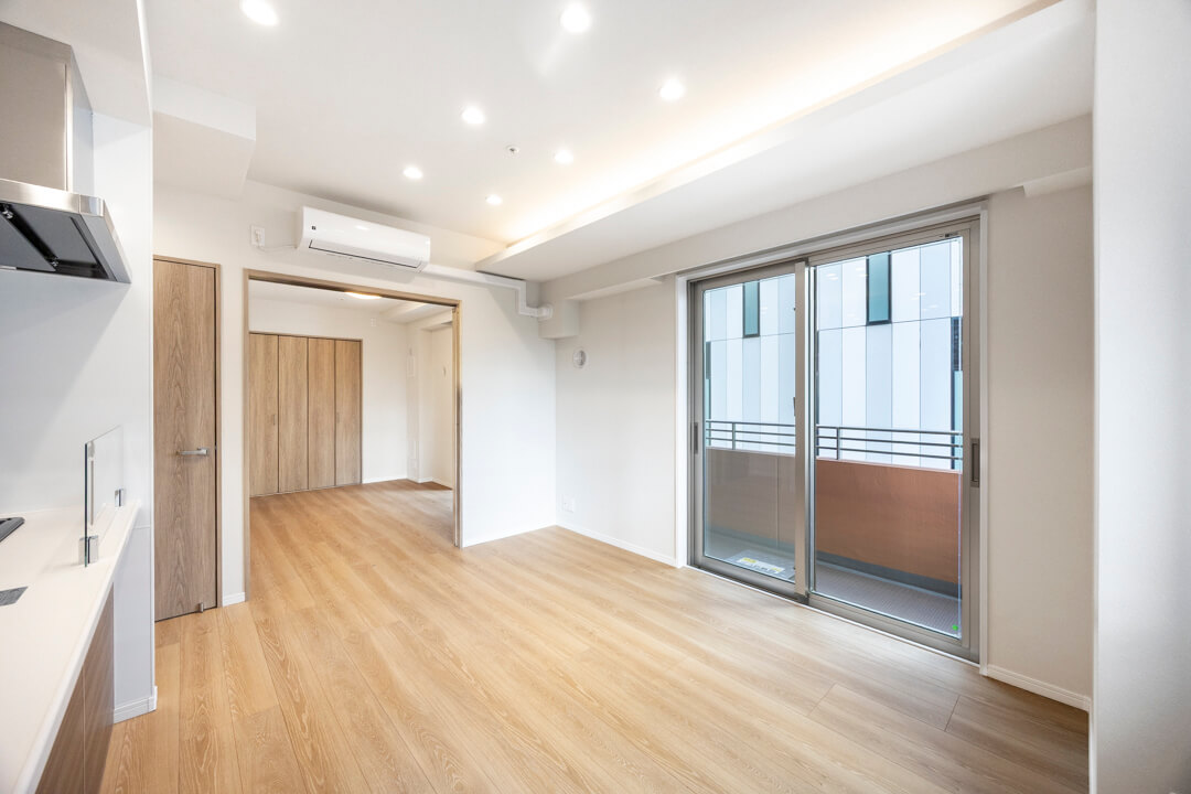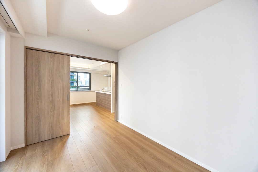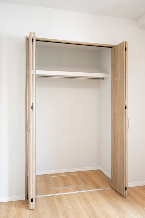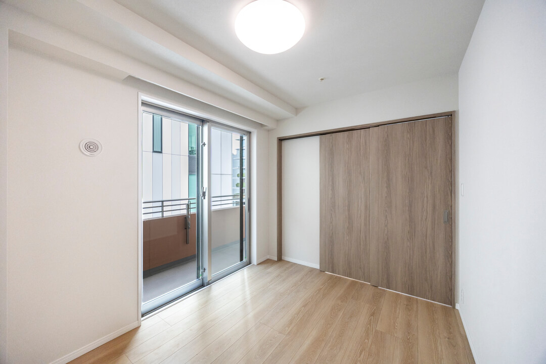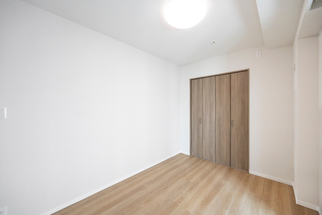 約5.88帖の洋室。バルコニー付きで奥行きのある空間です。4枚折れ戸のクローゼット完備で収納力◎。開口部分が大きく、荷物を出し入れしやすいのがポイントです。LDKとは引き戸で仕切られているので、普段は扉を開放してゆったり過ごし、ゲストが来た時は扉を閉めてプライベート空間を隠すと良いですね。