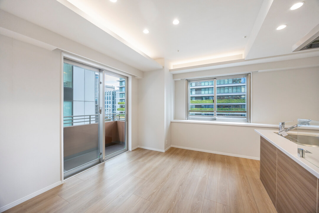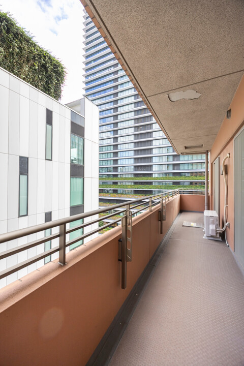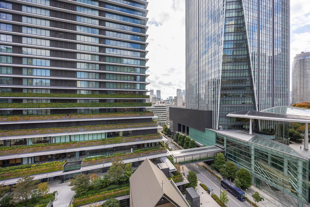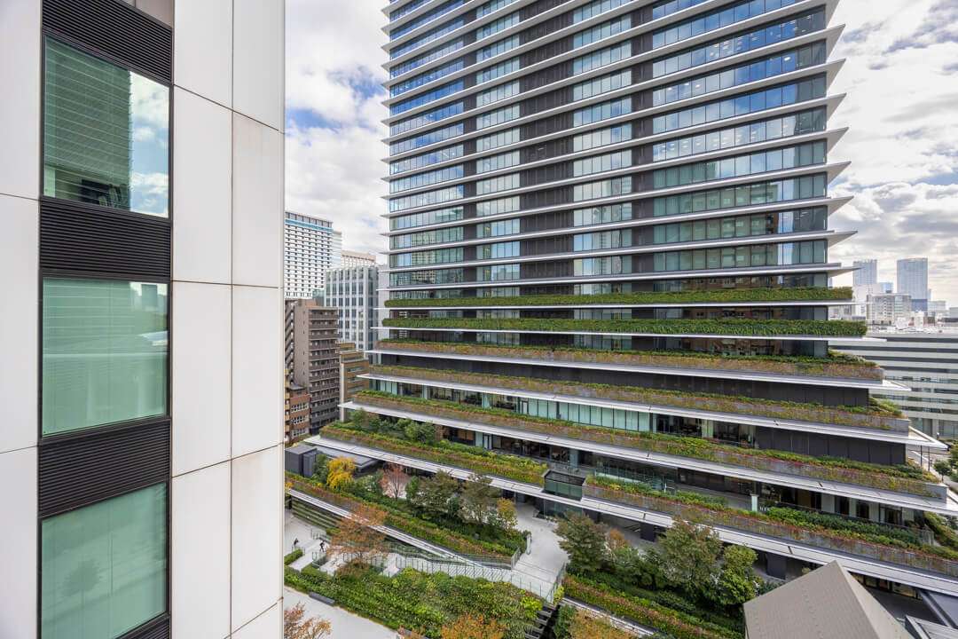 LDKと洋室に跨るワイドスパンバルコニー。12㎡超の広々としたスペースです。東側には虎ノ門ヒルズが見えます。