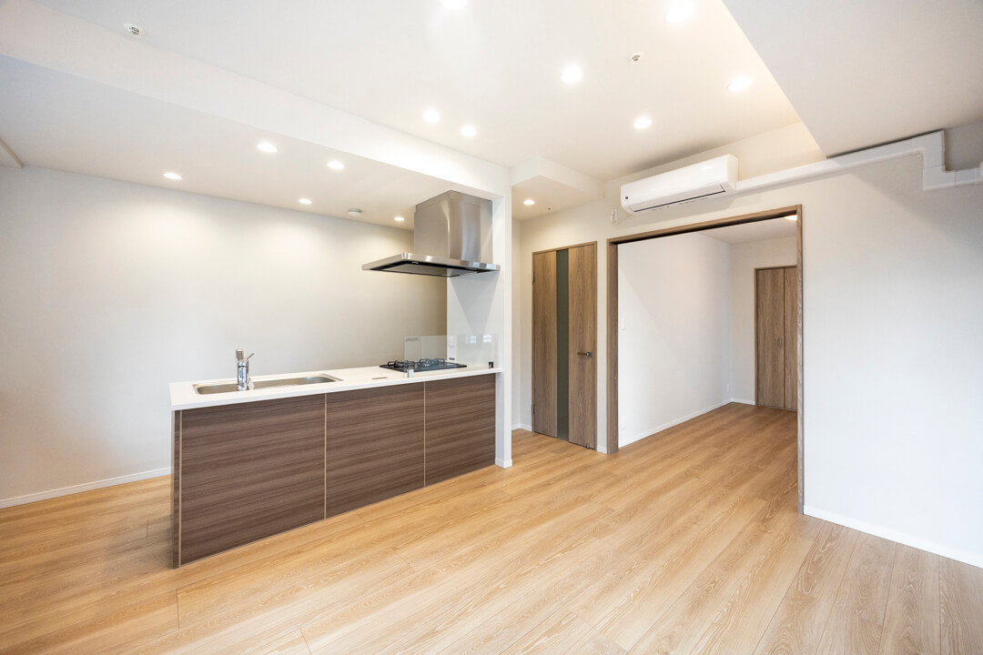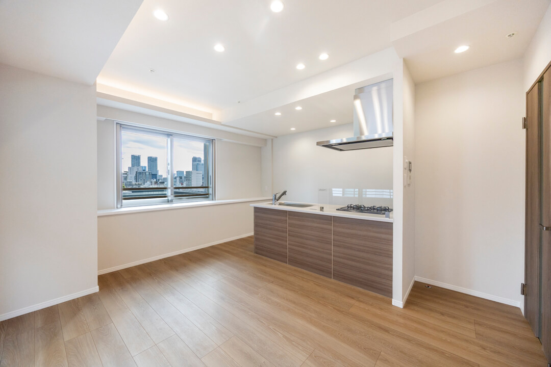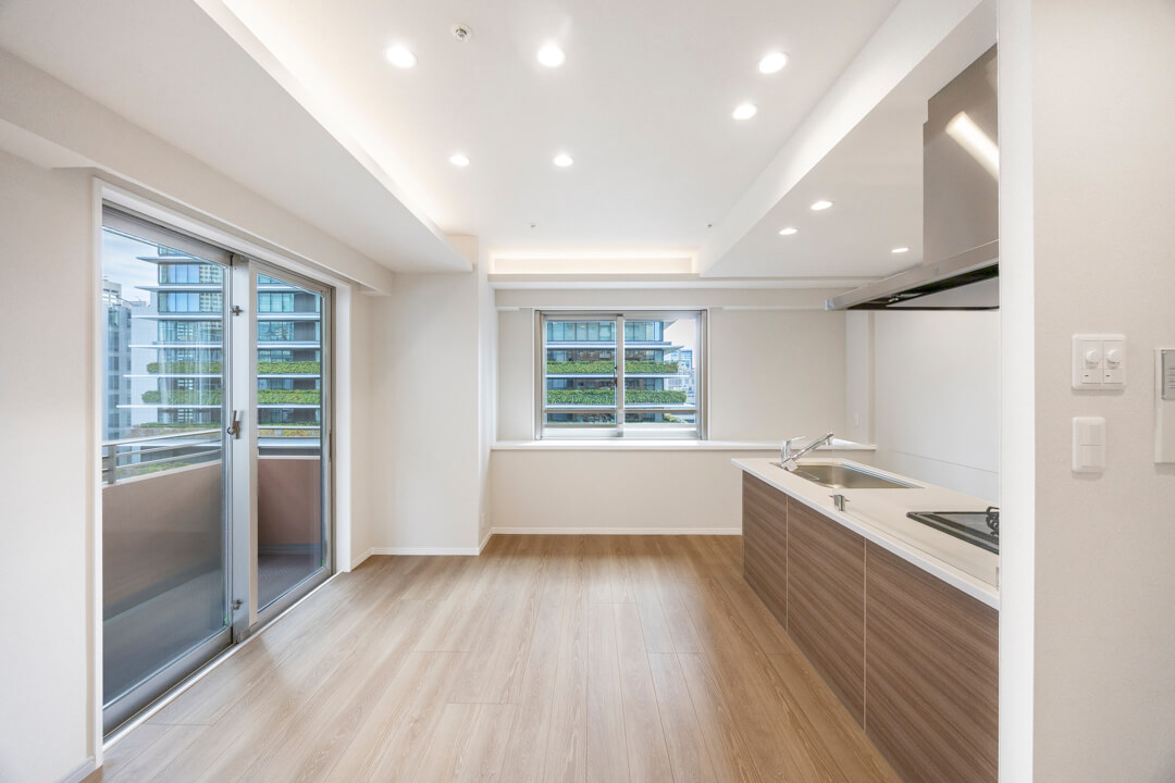 約12.59帖のLDK。折り上げ天井に間接照明が施され、光のグラデーションが上質な空間を演出します。やわらかな光が入る2面採光で、風通しも良好◎。フローリングは自然な風合いの木目柄で、さまざまなテイストの家具選びを楽しめそうです。
