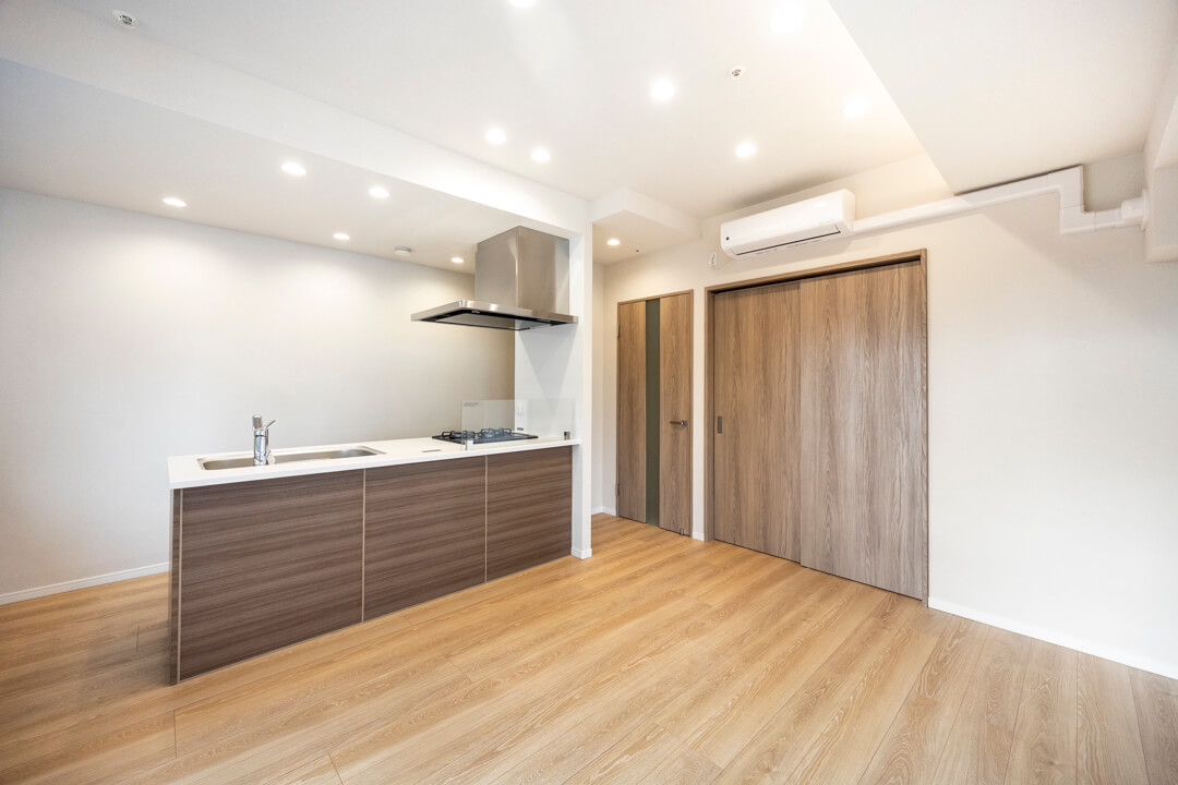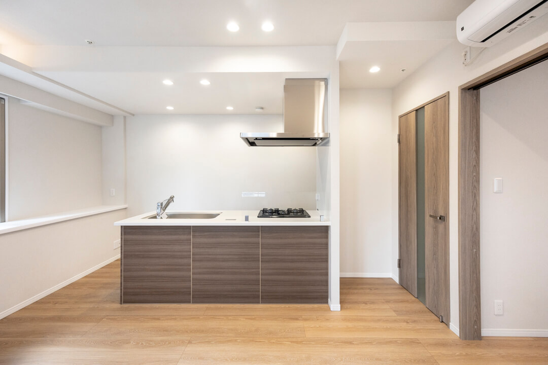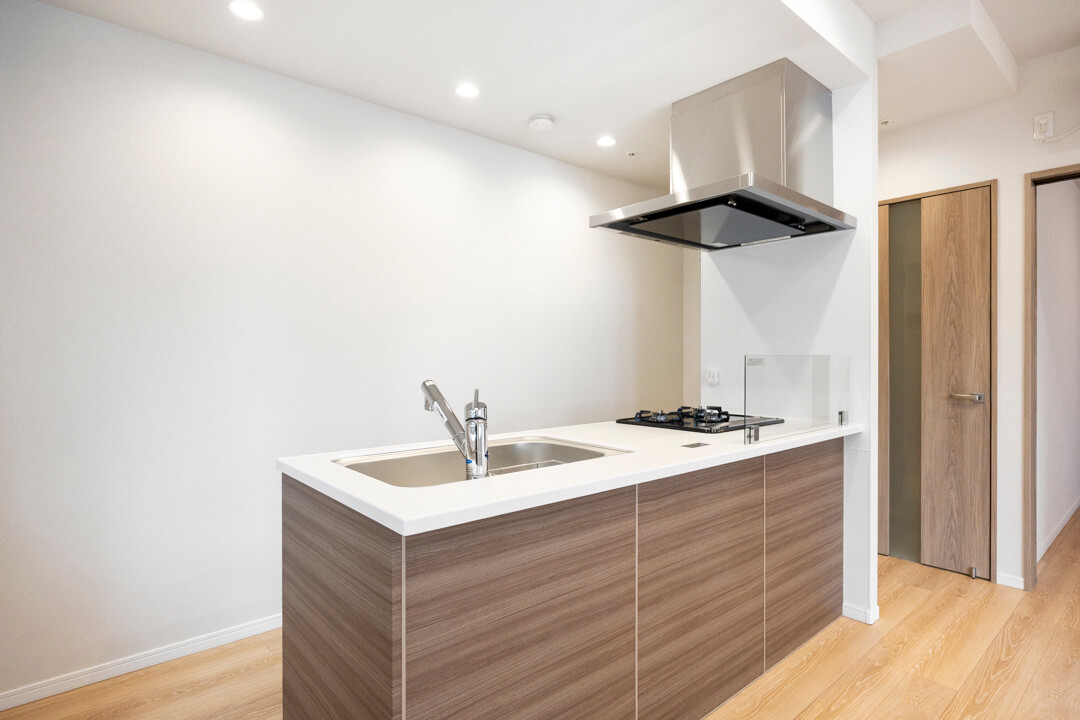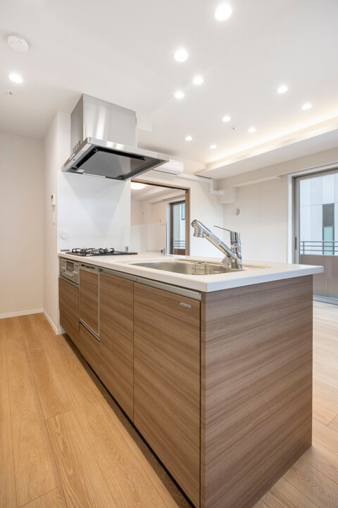 木目扉とホワイトカウンターのコントラストが美しく、空間に調和するキッチン。リビングダイニングを見渡せる、開放的な対面タイプです。パートナーやゲストとの会話を楽しみながら調理ができますね。コンロ前には油跳ねガードが設置されていて安心です。