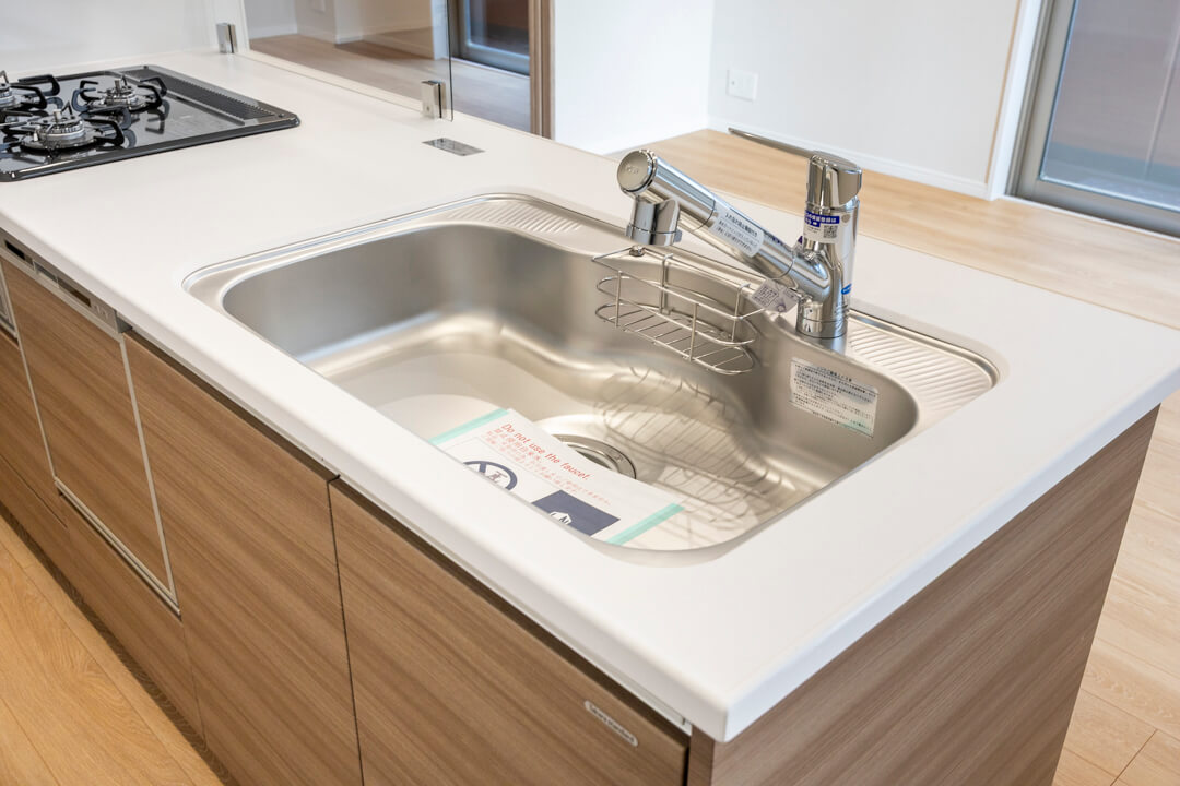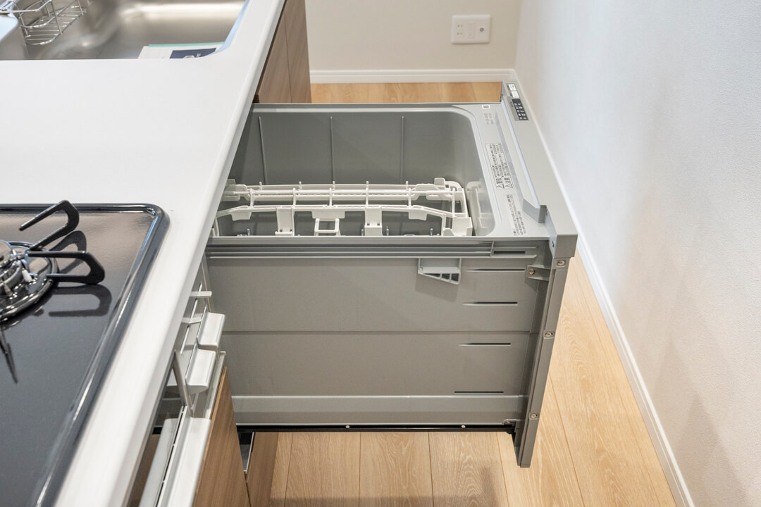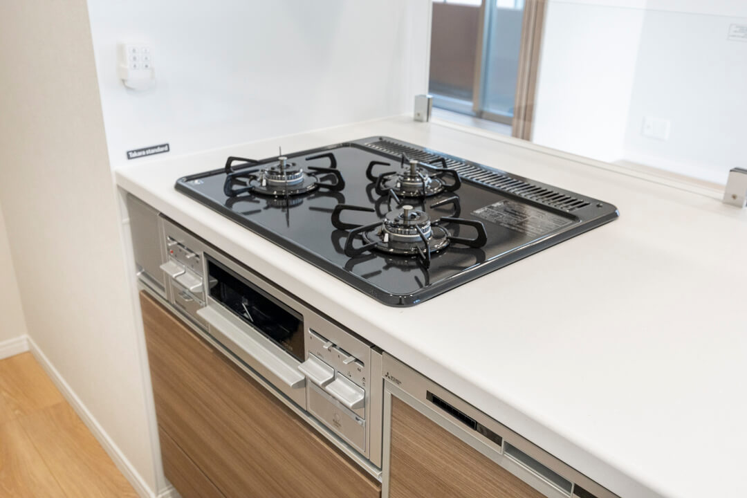 同時調理が叶うグリル付3口ガスコンロを内蔵。さらに、ディスポーザーと食洗機も完備されています。料理後すぐに生ゴミを処理できるので、悪臭の原因を防ぎ、掃除の手間を軽減。食器洗いも捗り、後片付けの時短が叶います。