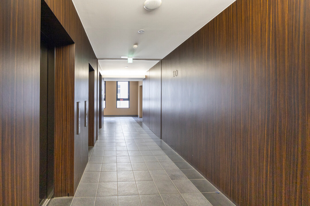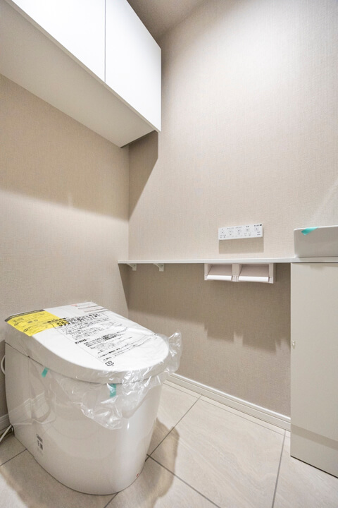 廊下に面していて独立性の高いレストルーム。TOTO製の洗浄機能付トイレに交換済みです。タンクレス仕様でスタイリッシュですね。便フタは自動開閉式なので、直接触れることなく使用できて衛生的。手洗いカウンター付きで、ゲストを洗面室まで案内する手間がかからないのも助かります。