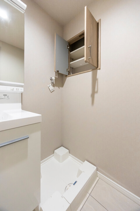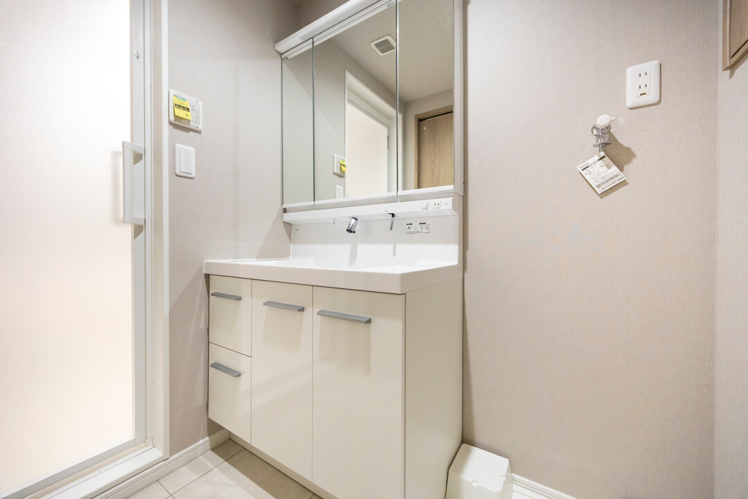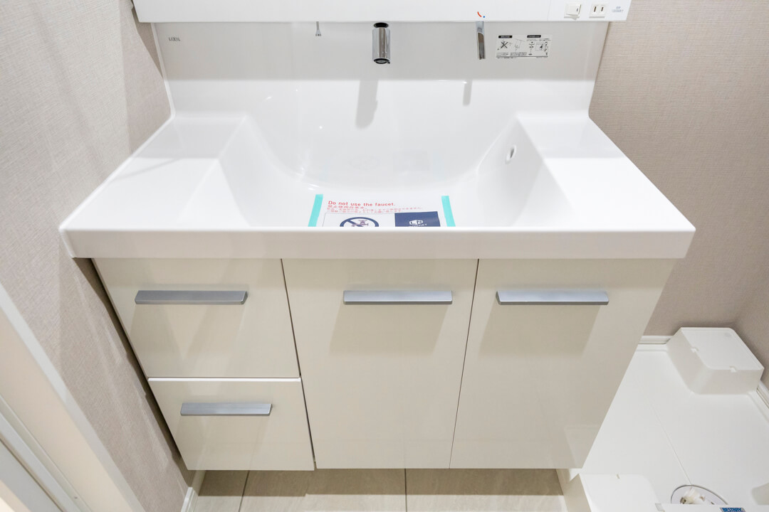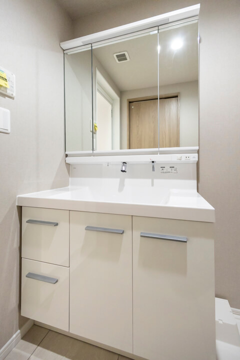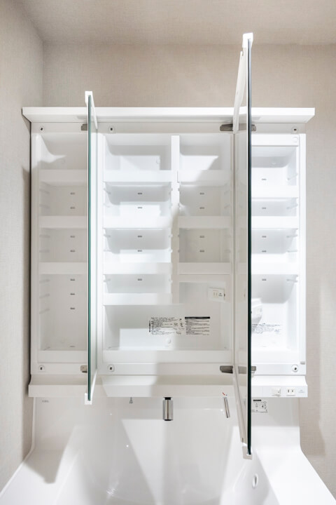 白基調で清潔感のある洗面化粧台。三面鏡付きで身だしなみを整えるのに便利です。バックガードまで一体成形でお手入れ簡単。上から水が出る仕様なので、水栓まわりに水が溜まらないのも嬉しいポイントです。