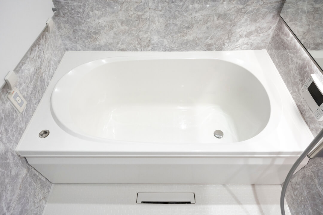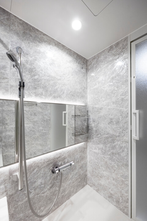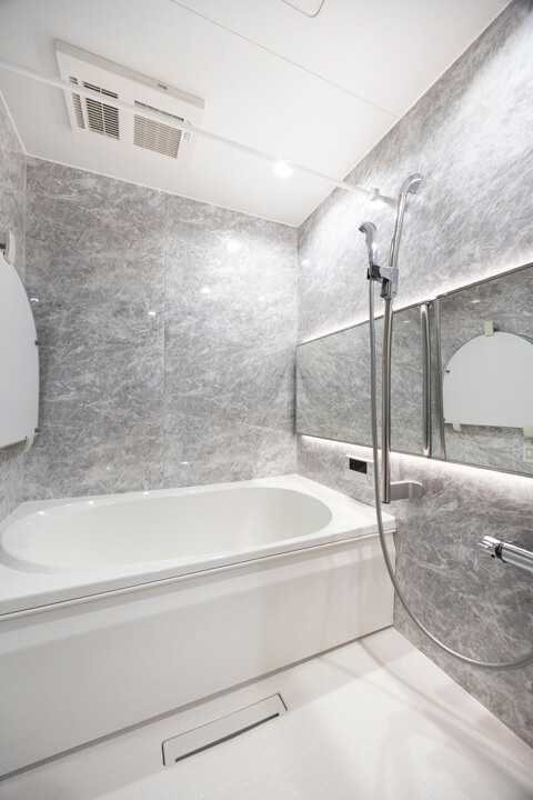 石目模様の壁パネルとワイドミラー、間接照明が高級感を演出するバスルーム。ワイドミラーには空間を広く見せる効果もあります。換気・暖房・乾燥・涼風機能付きで1年中快適なバスタイムに。お風呂にゆっくり浸かるのが好きという方に嬉しい追い焚き機能も搭載されています。
