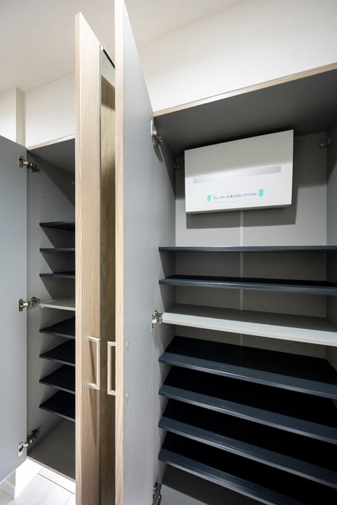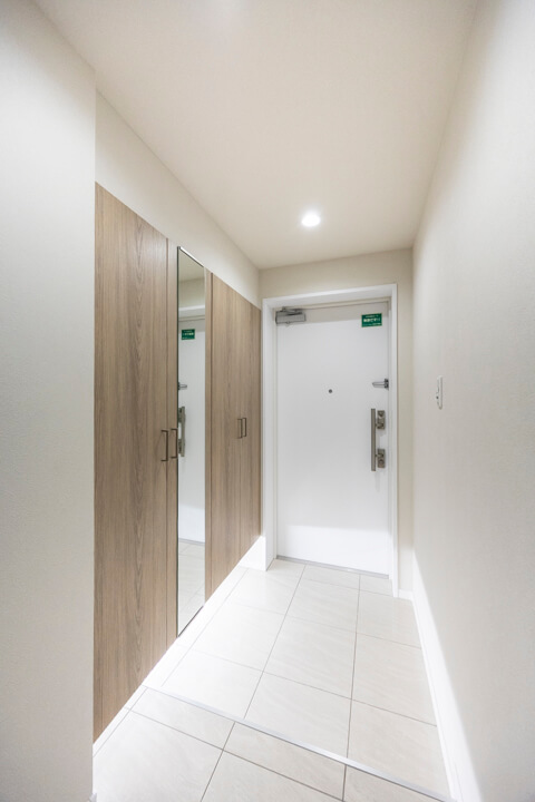 フットライトの明かりが足元をやわらかく包み込む玄関。大容量のシューズボックス完備で、散らかりがちな靴をすっきり収納できます。扉の一部が鏡張りになっていて、お出かけ前の身だしなみチェックができるのも嬉しいポイントです。