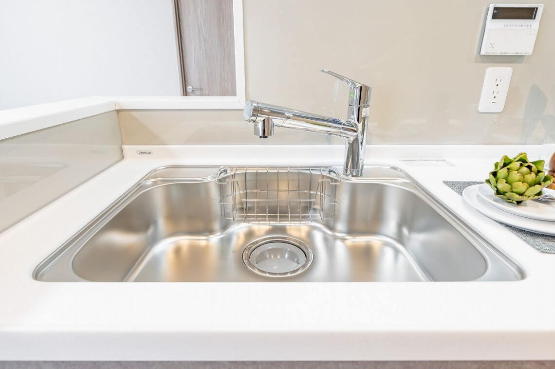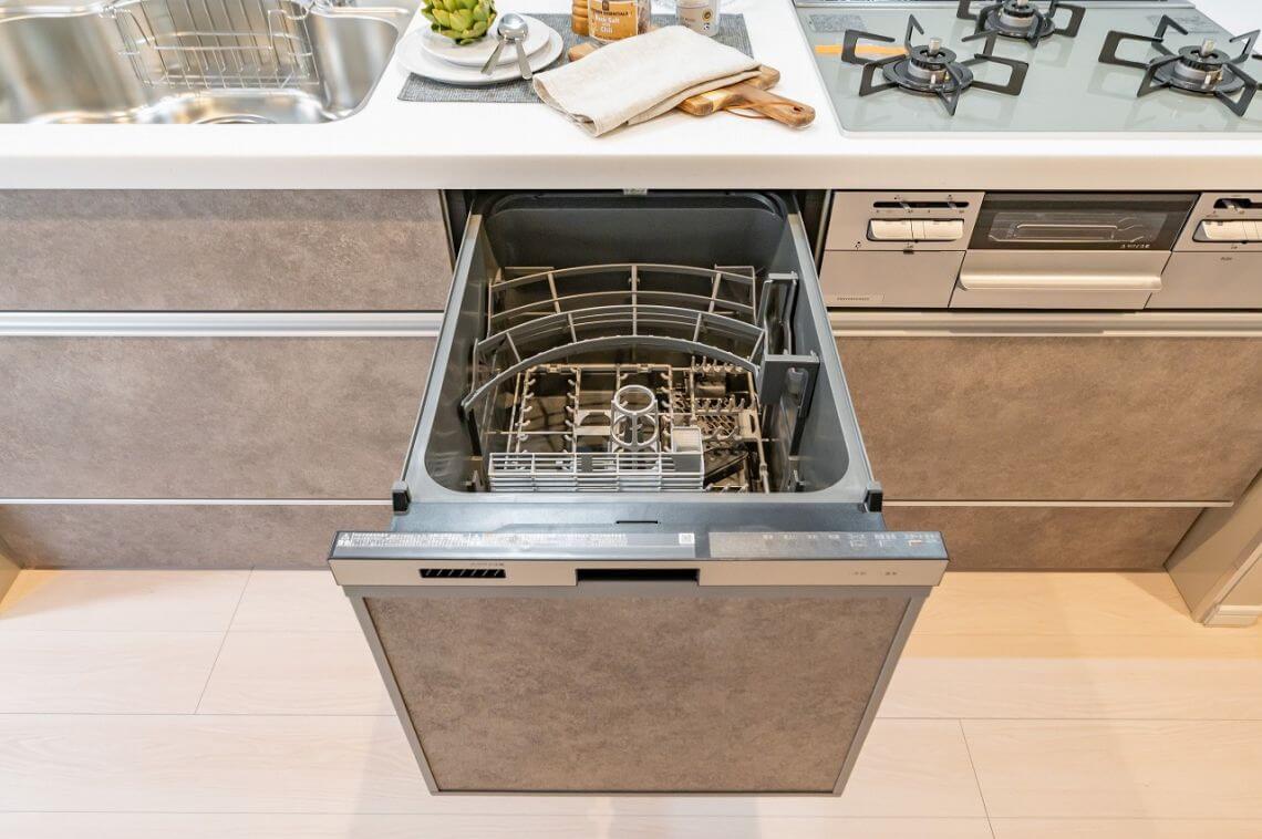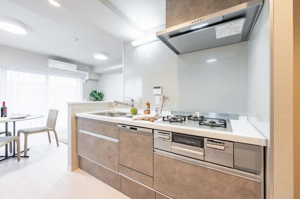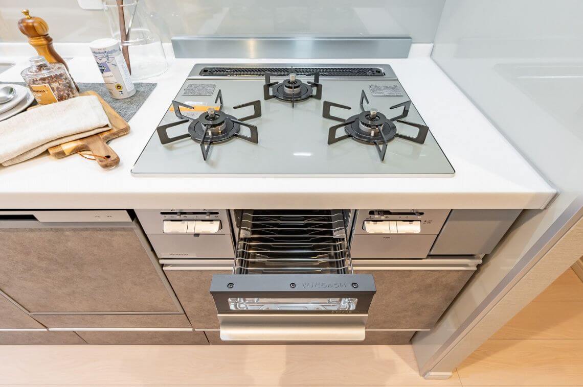 3口コンロ、グリル、食洗機付きと設備面が充実しているキッチンです。作業スペースには、コンセントがあるのでミキサーなどのキッチン家電が使いやすくなっています。また、背面にはゆとりがあり、棚なども置くことができますよ。冷蔵庫置場は奥に配置されているため生活感を隠せます。