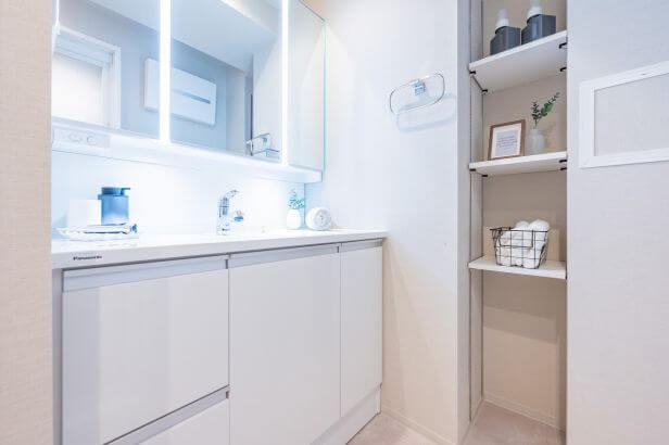 Panasonic製の洗面化粧台は、三面鏡の中に化粧品などが収納できて使い勝手が良好です。照明が縦に配置されているので、顔に影をつくらないのも◎。洗面ボウルとカウンターは一体型のためお手入れも簡単です。また、横には可動棚が設置されており、リネン類などを置くこともできます。