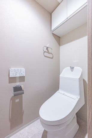 ウォシュレット一体型のトイレです。上部には吊戸棚が設置されているので、トイレットペーパーや掃除用具などを収納できます。