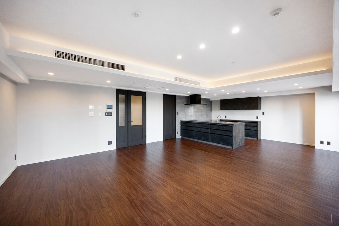 約27.2帖の広々としたリビングダイニングキッチン。大きめの家具も配置できそうで、インテリアにこだわることができそうです。また、天井には間接照明があしらわれていて、お部屋を上品な雰囲気に包んでくれています。