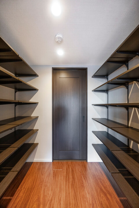約2.1帖のパントリーが造られています。可動棚が設置されており、調味料やストック類などを収納することができます。また、シューズインクローゼットからも出入りができるので、帰宅してすぐにアクセスできるのも嬉しいですね。