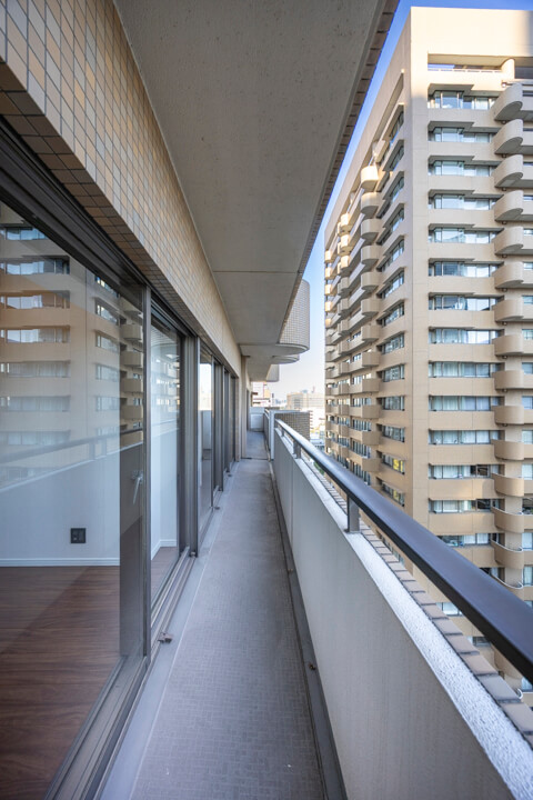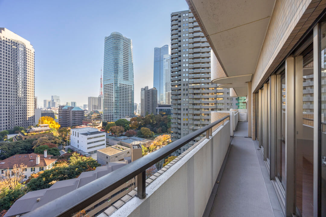 ワイドスパン設計のバルコニーは、南東向きのため日当たりが良好です。全ての居室からアクセスができる便利な動線になっています。また、15階部分で目の前には開放的な眺望が広がります。東京タワーや麻布台ヒルズが望め、都心を象徴する景色を楽しめます。敷地内にある庭園などの緑も見えるので、四季を感じることもできますよ。