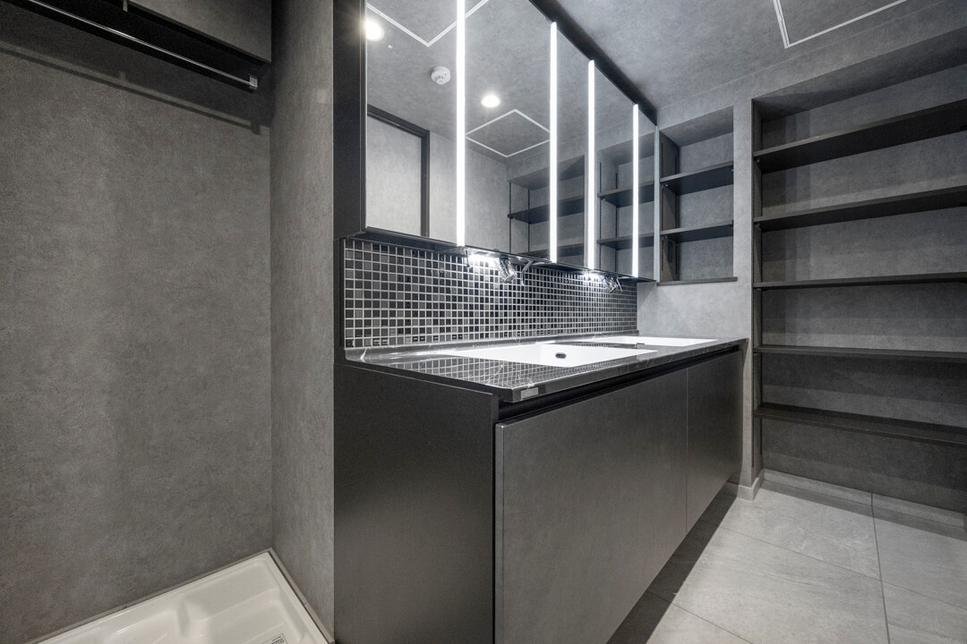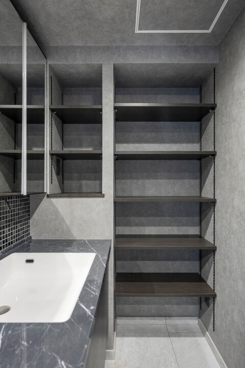 ホテルライクな2ボウル洗面の化粧台です。忙しい朝でも並んで支度ができるので嬉しいですね。グレートーンでまとめられたスタイリッシュな雰囲気で、可動棚が設置されており、ごちゃごちゃしがちな洗面まわりもきちんと整頓できます。