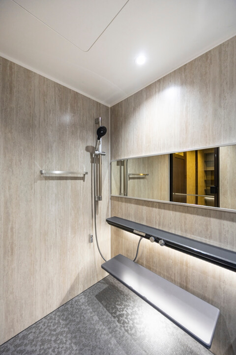 1620サイズでゆったりと入浴ができるバスルームです。照明には調光機能が付いているので、その日の気分に合わせて浴室の雰囲気を変えることができますよ。また、浴室乾燥機には暖房・乾燥・換気・涼風の機能がついており、一年中快適に過ごせます。