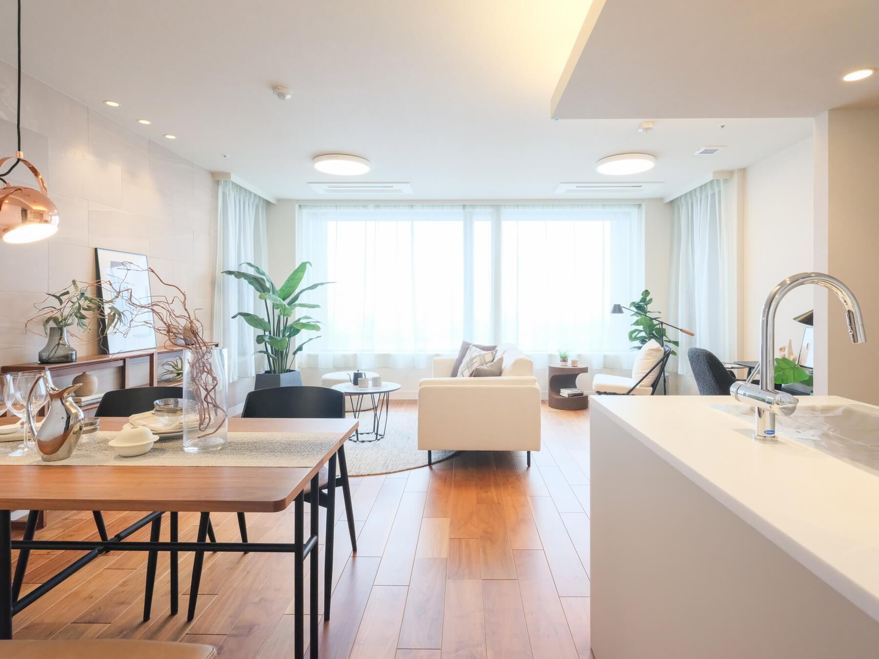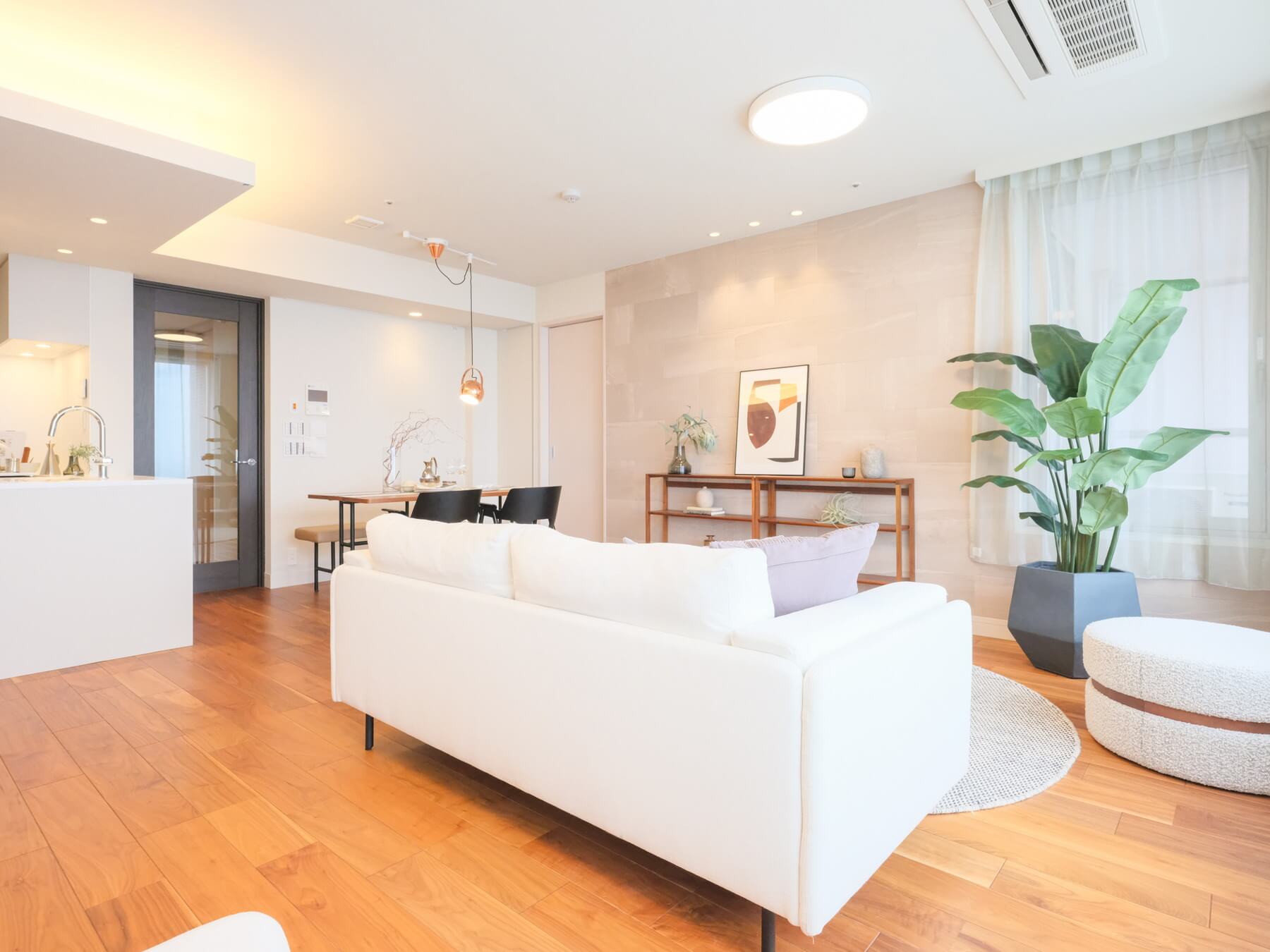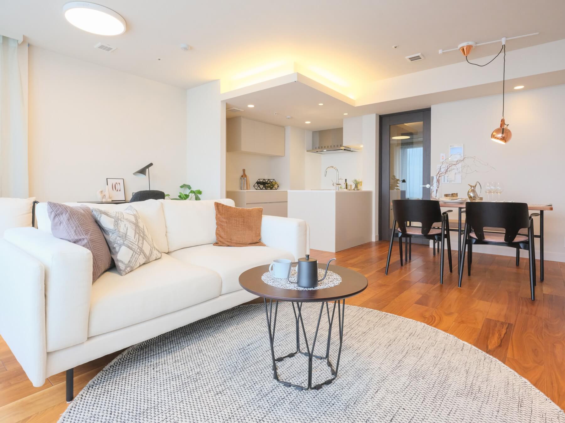 明るい光がたっぷり降り注ぐ、3面採光のリビングダイニング。キッチンと合わせて約20.1帖の広々とした空間です。家族はもちろん、ゲストを招いてもゆったり過ごせそうですね。さりげないアクセントウォールや間接照明が高級感と上品さを演出します。