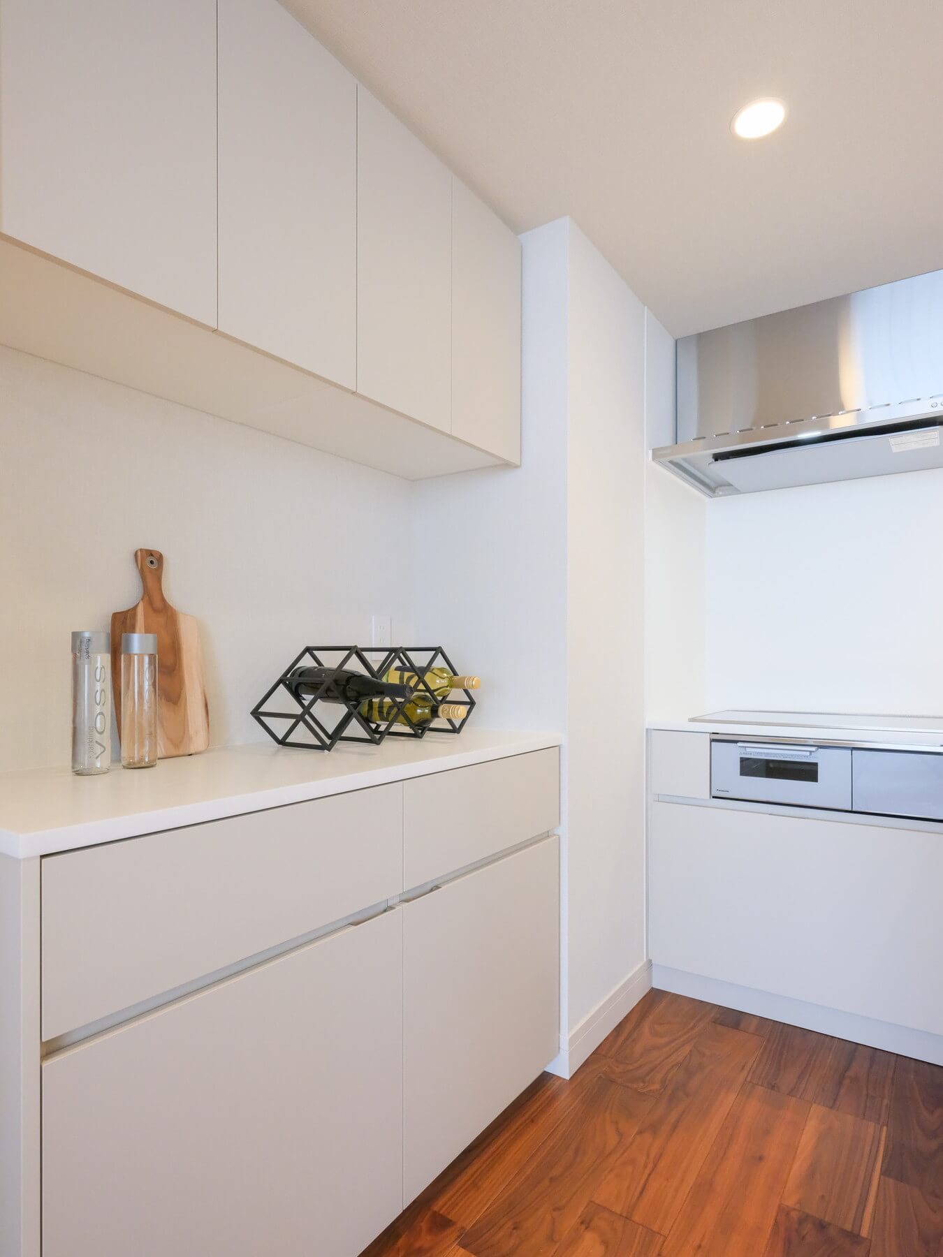 カップボード完備で収納力◎。キッチンと同じデザインで統一感があります。食料品のストックや食器類を整理整頓でき、ごちゃごちゃしがちなキッチンまわりがすっきり片付きそうです。