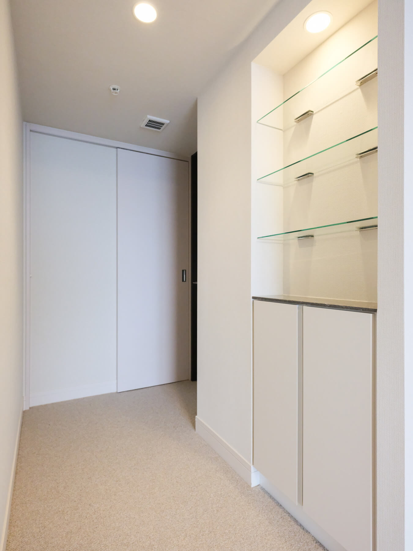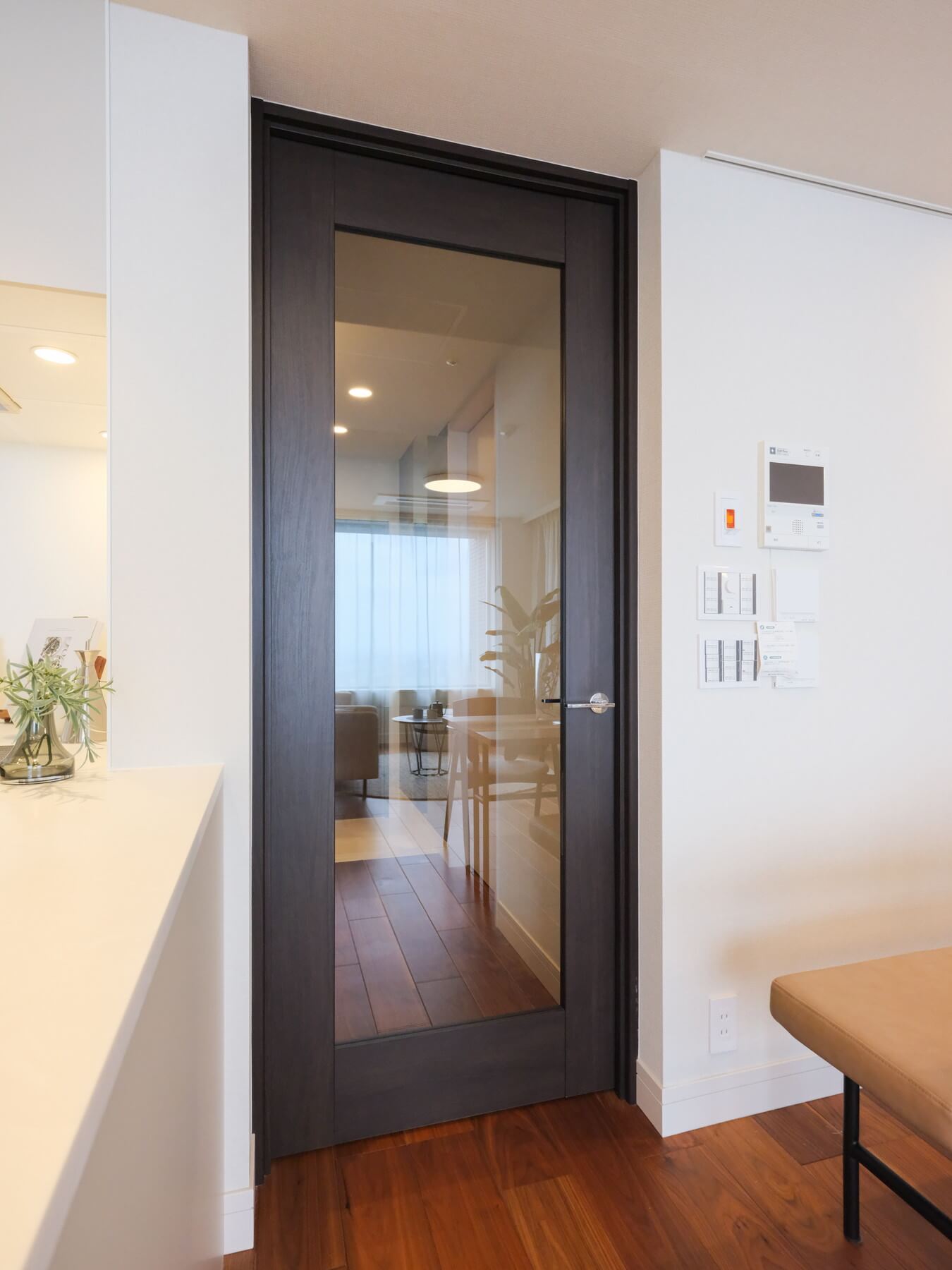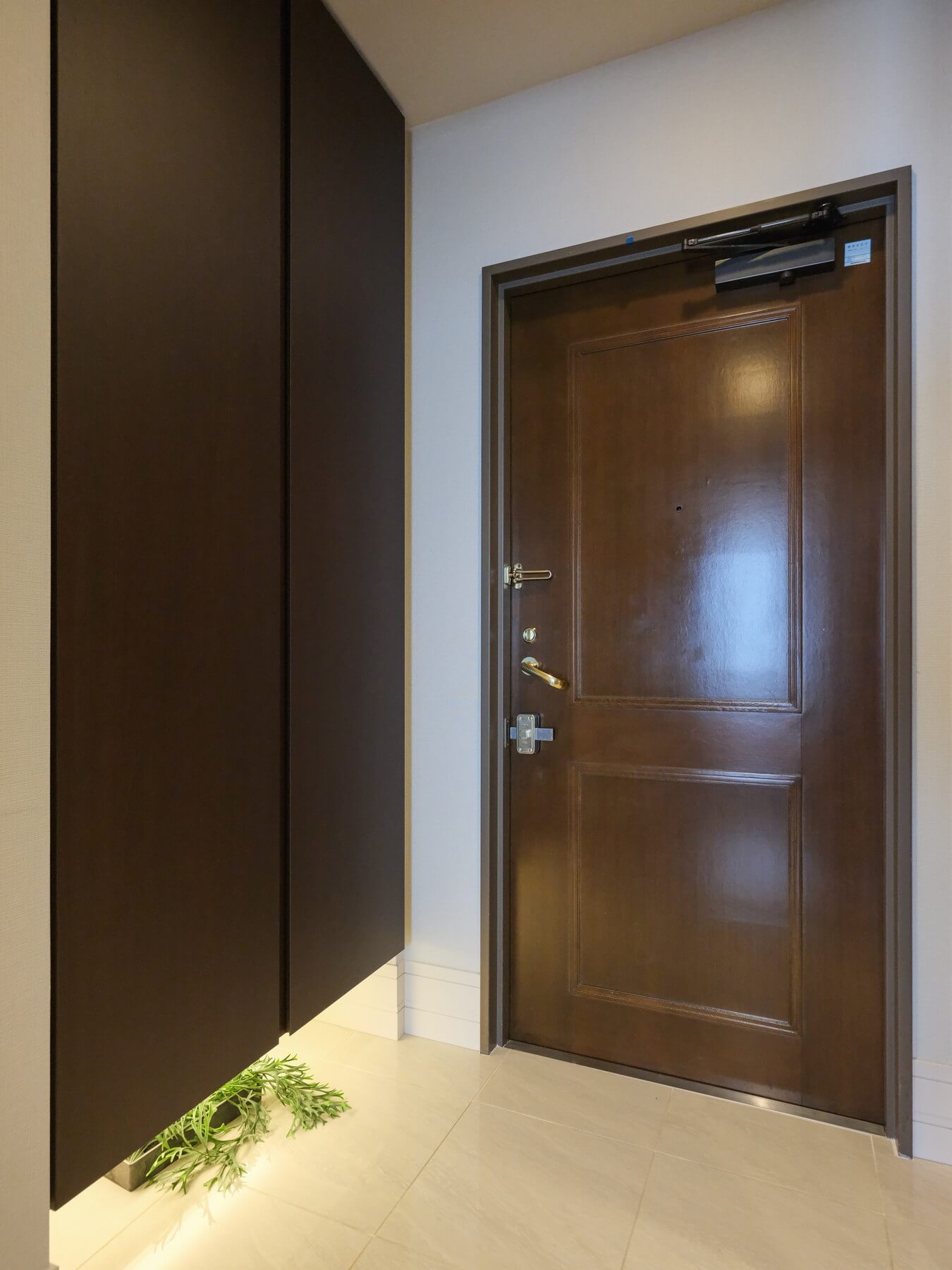 ダークトーンの建具が重厚感を醸し出す玄関。入って右手にはシューズボックスがあり、散らかりがちな靴をすっきり収納できます。向かい側にはアクセントウォールが施され、お出かけ前の身だしなみチェックに便利な全身鏡も設置されています。