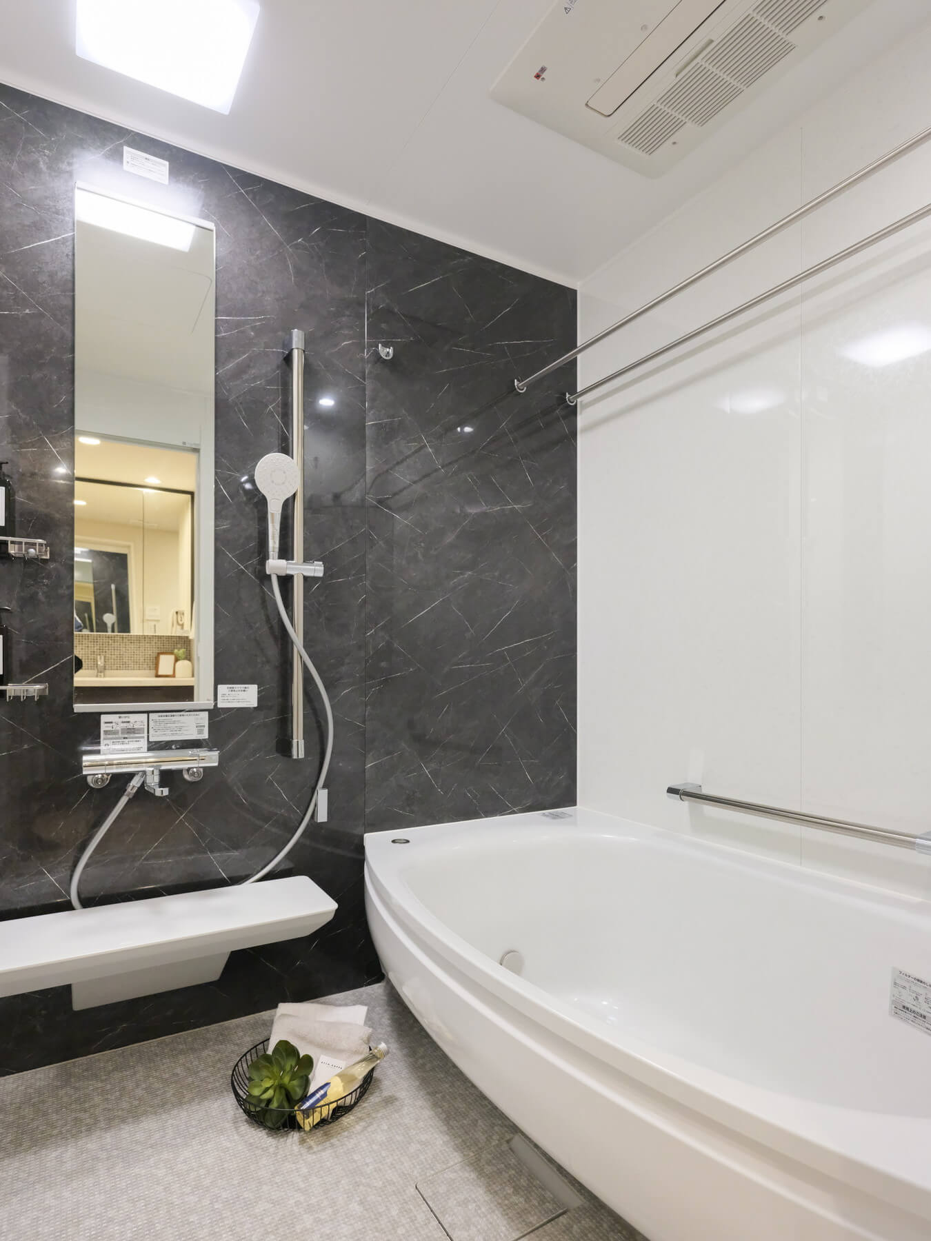 石柄のアクセントパネルを採用し、高級感の漂うバスルーム。カーブが美しい浴槽が、疲れた身体を包み込んでくれそうです。浴室換気乾燥機・追い焚き機能搭載で1年中快適なバスタイムを過ごすことができます。