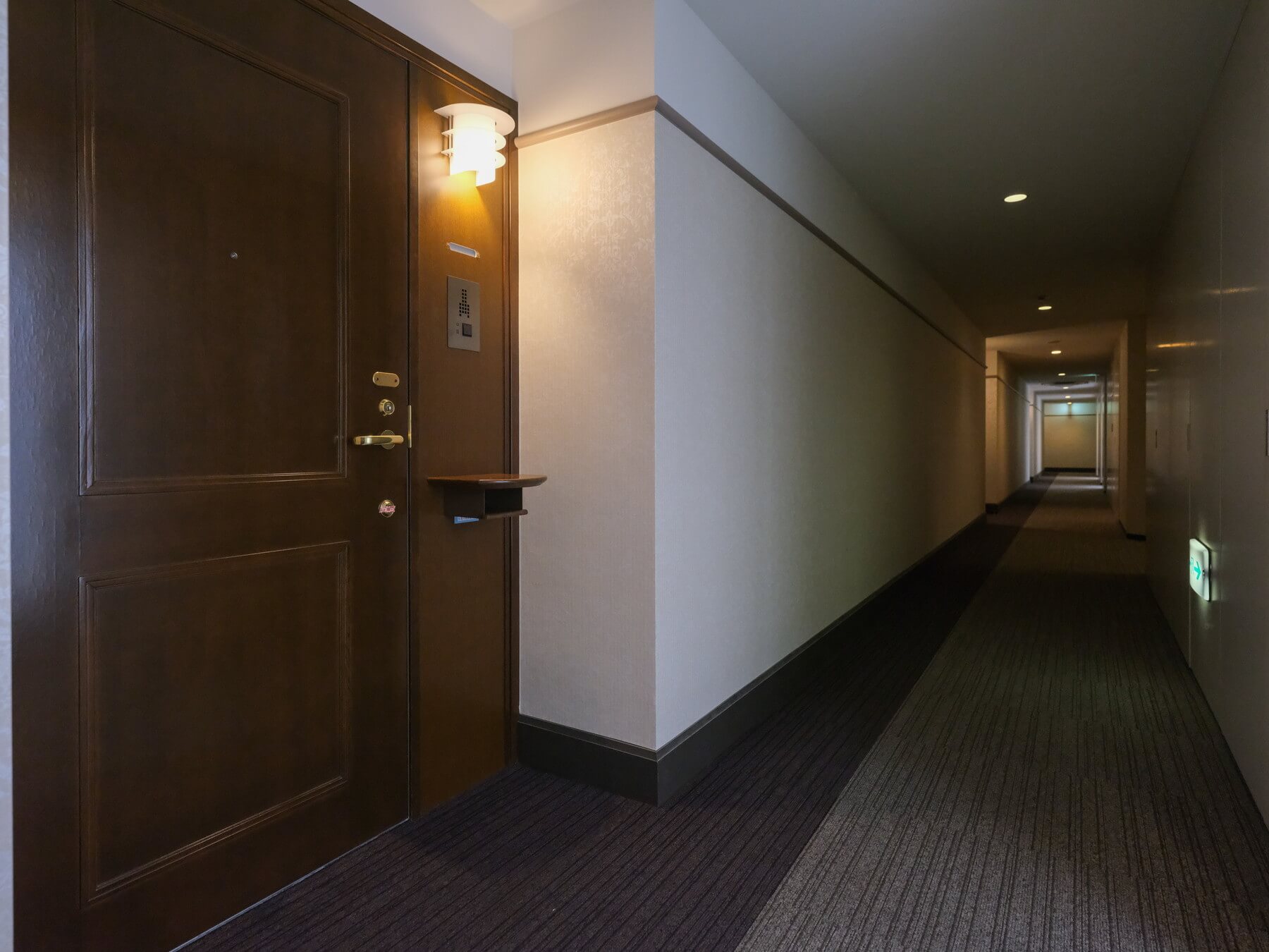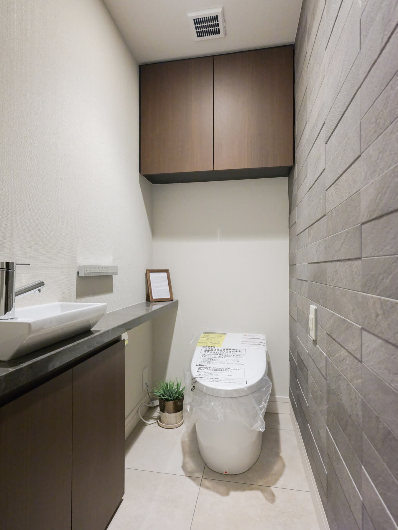 廊下に面していて独立性の高いレストルーム。アクセントウォールが洗練された空間を演出します。TOTO製の洗浄便座付トイレに新規交換済み。タンクレス仕様ですっきりとした印象です。手洗いカウンターなのですぐに手を洗うことができ、ゲストを洗面室まで案内する手間もかかりません。