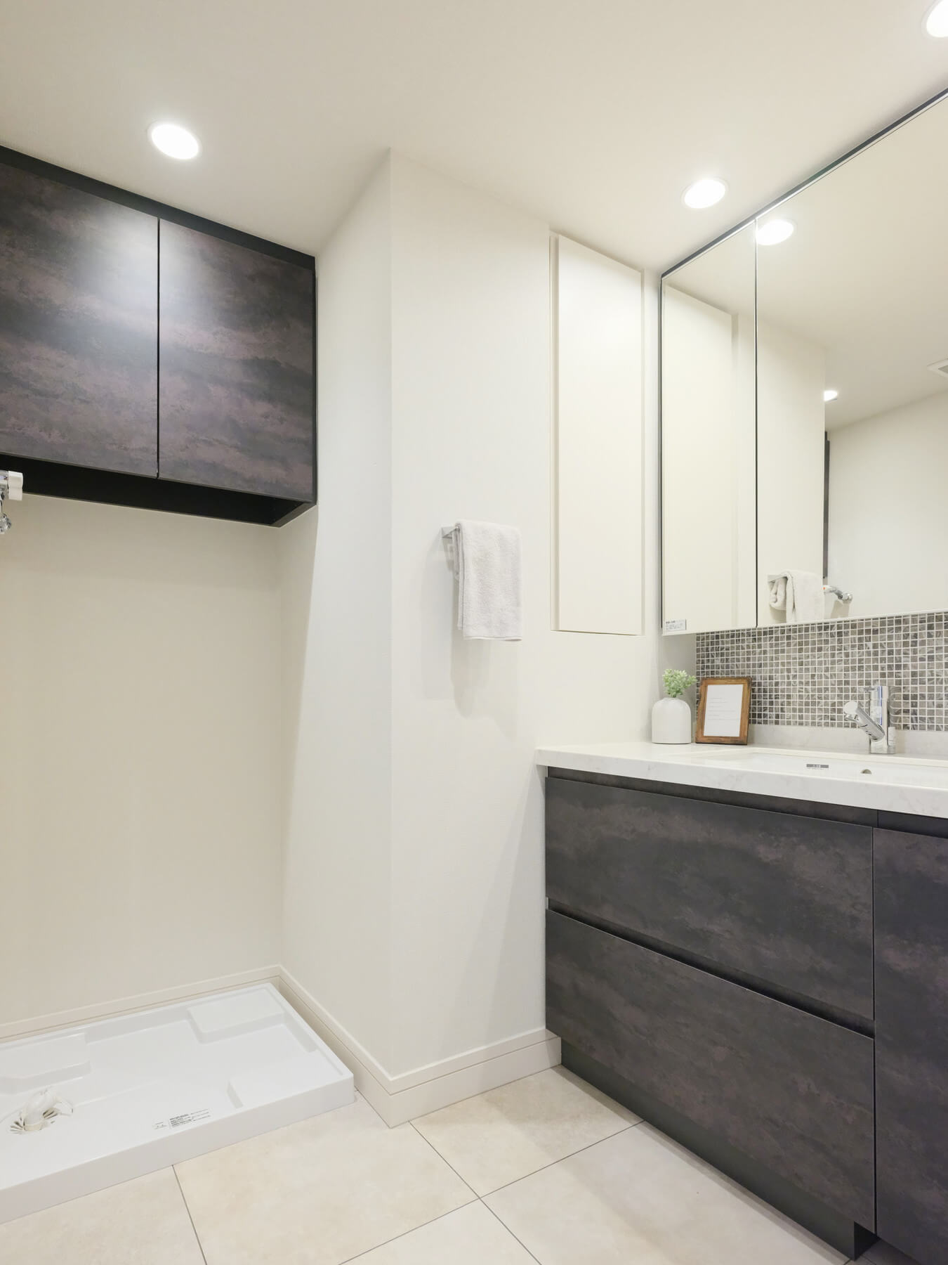 脱衣スペースを兼ねた洗面室。大きな三面鏡付きの洗面化粧台が設置されています。モザイクタイルのバックガードがスタイリッシュな雰囲気を演出。洗濯機置き場の上には吊戸棚があり、洗濯用品をすっきり収納できます。