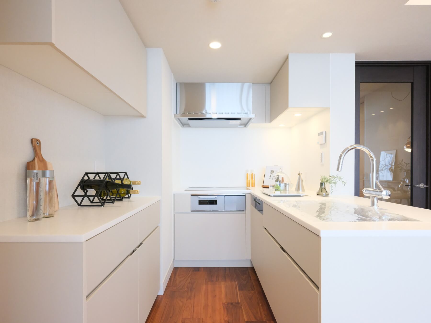 作業動線が短く、効率良く調理ができるL型キッチン。2人での調理も快適に行えそうですね。スイッチで火力を調節でき、ガスコンロよりも調整が簡単なIHクッキングヒーターを採用。お手入れのしやすさも嬉しいポイントです。食洗機も内蔵されていて、後片付けの時短が叶います。