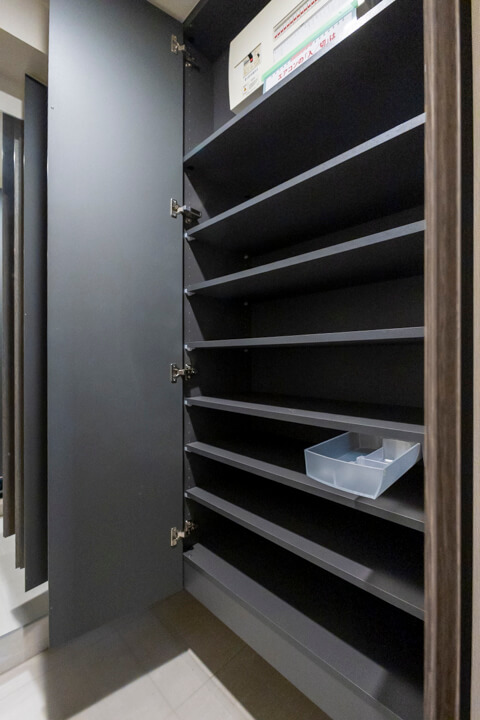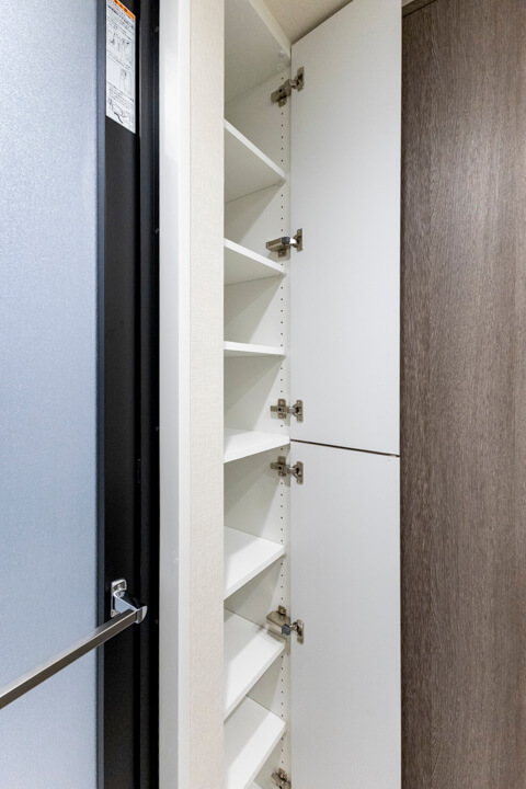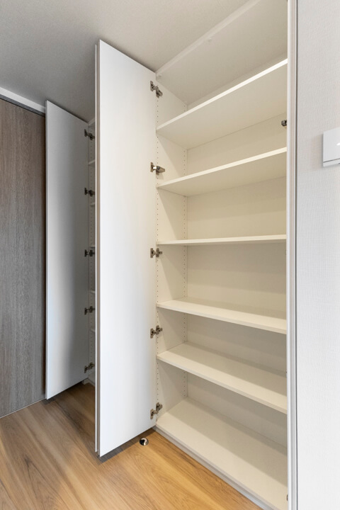 LDKに入ってすぐ左手には物入を完備しています。天井まで高さがあり、収納力◎。自由度の高い可動棚で、生活小物や日用品ストックなどをたっぷり収納できます。散らかりがちなリビングがすっきり片付きそうですね。