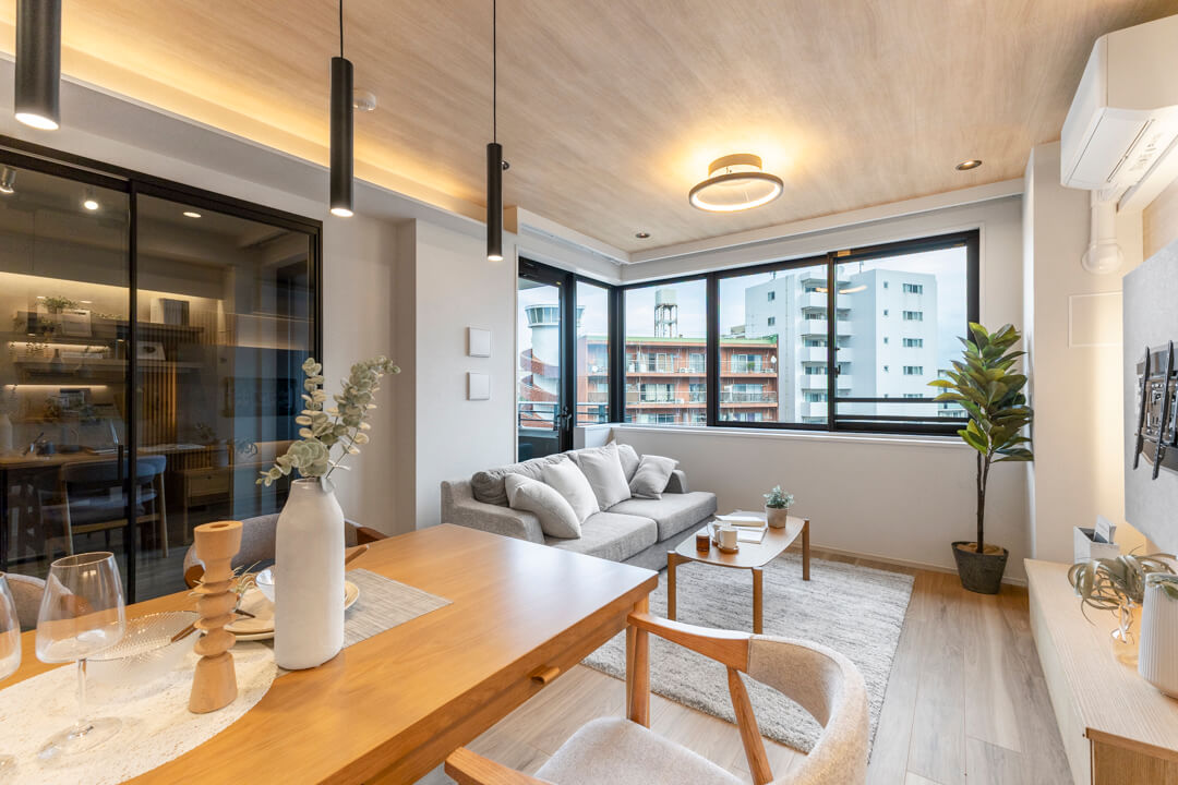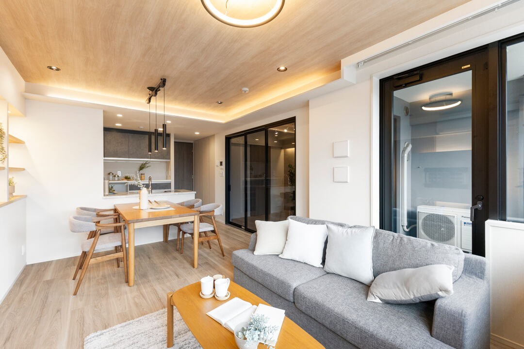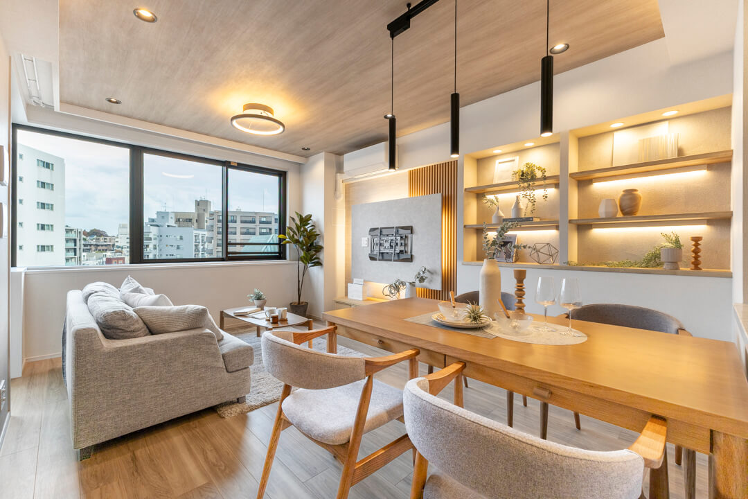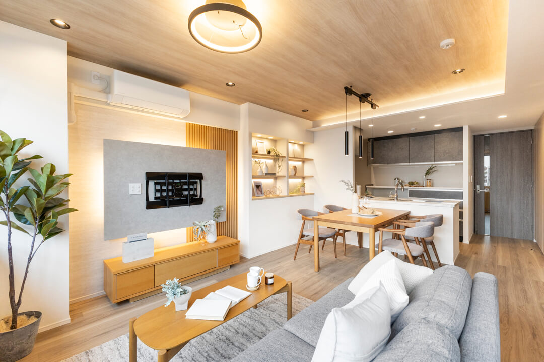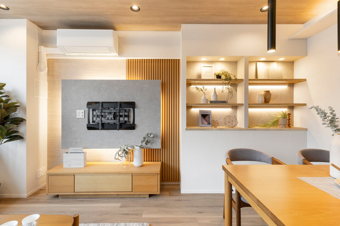 約12.2帖のリビングダイニング。フローリング調の天井やアクセントウォール、間接照明の明かりが、ぬくもり溢れる空間を演出します。穏やかなリラックスタイムを過ごせそうですね。テレビを壁掛け設置でき、すっきりとした見た目で掃除がしやすいのもポイントです。飾り棚を活用し、見せる収納をお楽しみください。
