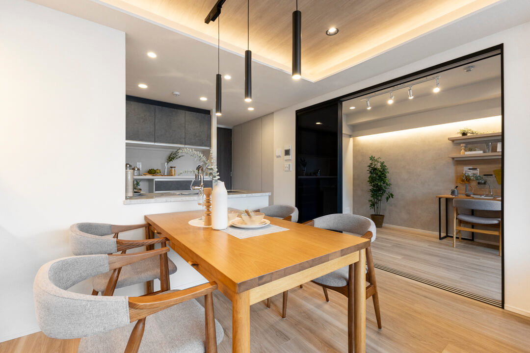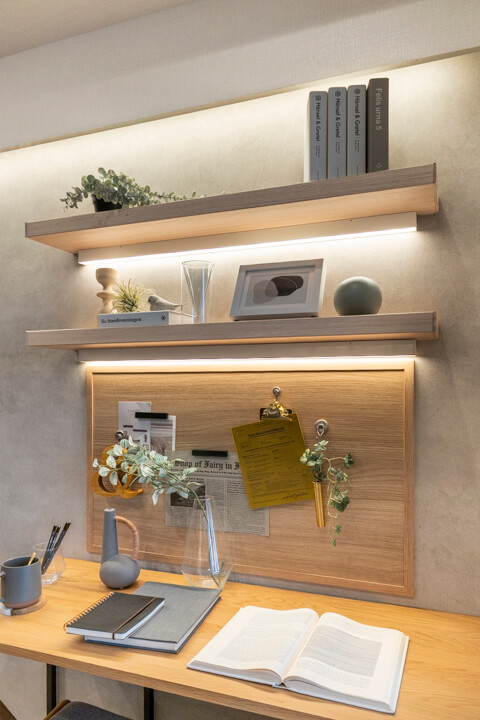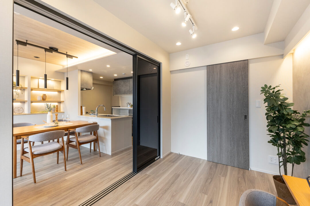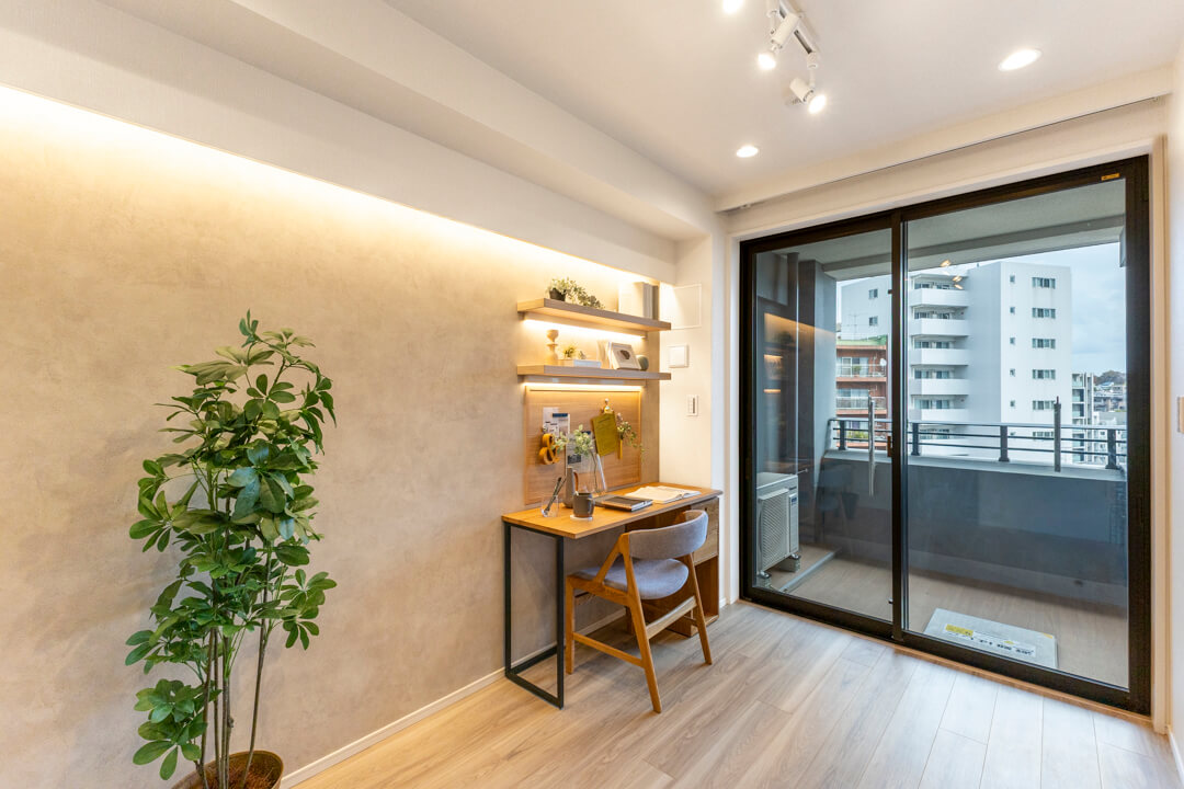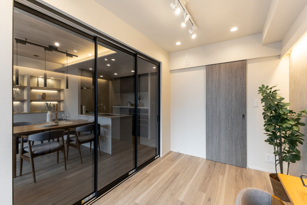 LDKに隣接する、約5.1帖の洋室2。間仕切りにクリアブラックの引き戸を採用し、家族の存在を感じながらもほど良いこもり感がある空間です。アクセントウォールや間接照明で洗練された印象に。飾り棚&木製ボード備え付けで、自分好みのワークスペースをつくれそうです。WIC(ウォークインクローゼット)完備で豊富な収納も魅力です。