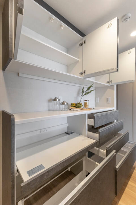 背面には収納力のあるカップボードを完備。キッチンと同じデザインで統一感があります。食料品のストックや食器類を整理整頓でき、いつも清潔なキッチン空間をキープできそうです。引出し可能なトレイボードにはコンセントが付いていて、キッチン家電の使用に便利です。