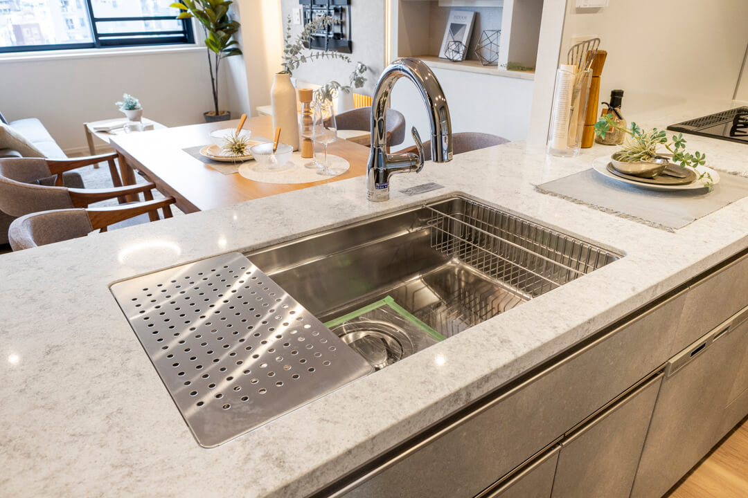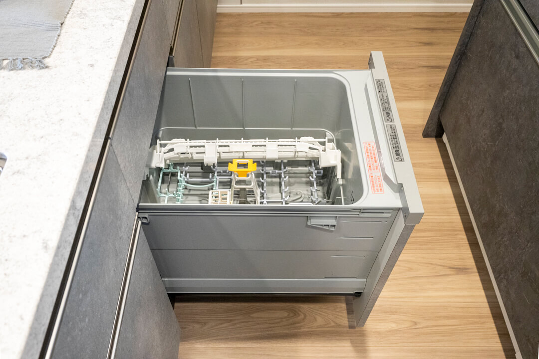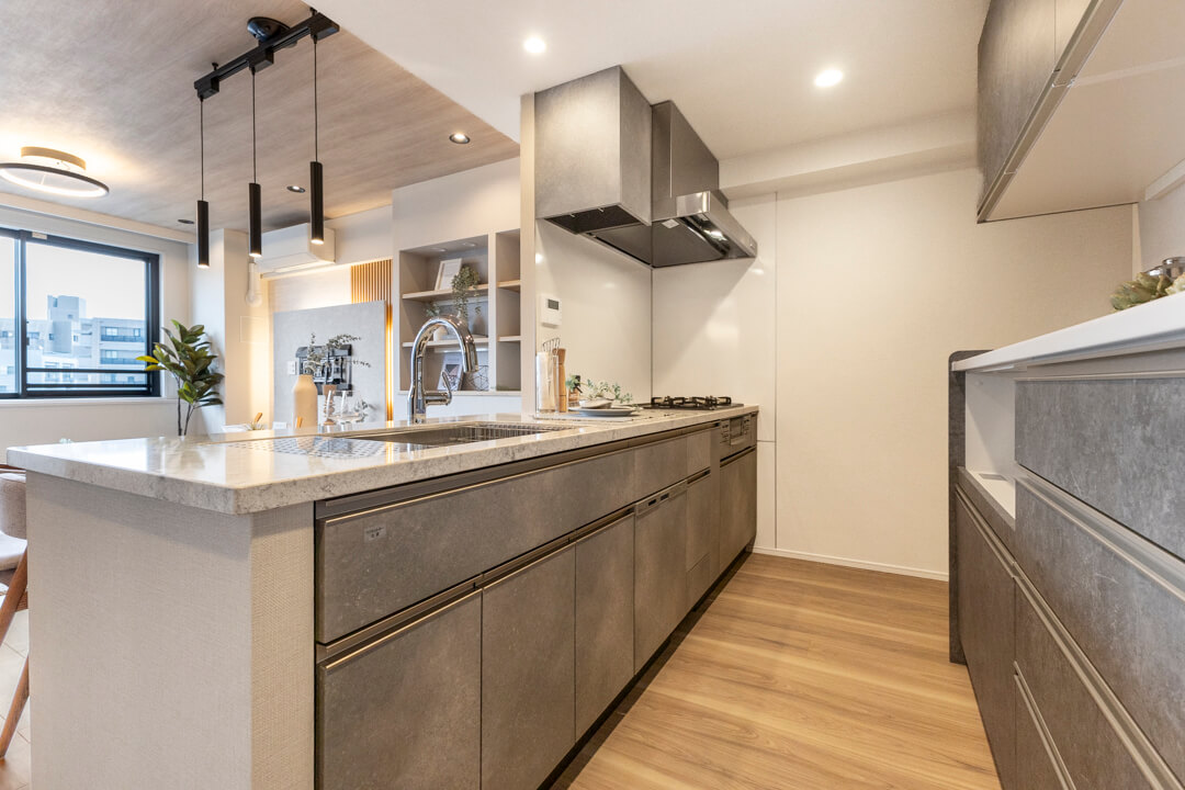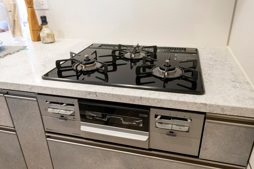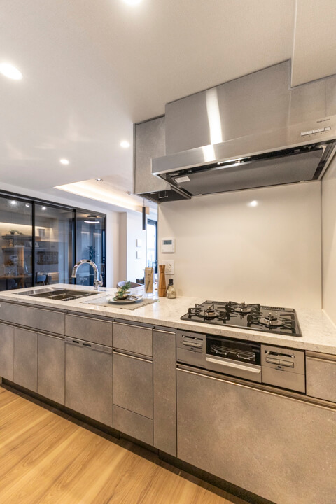 約3.5帖のキッチンスペース。シンク側からはリビングダイニングを見渡すことができ、家族やゲストとの会話を楽しみながら作業ができます。グリル付3口ガスコンロ・食洗機内蔵で調理も後片付けも捗りそうですね。
