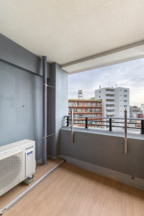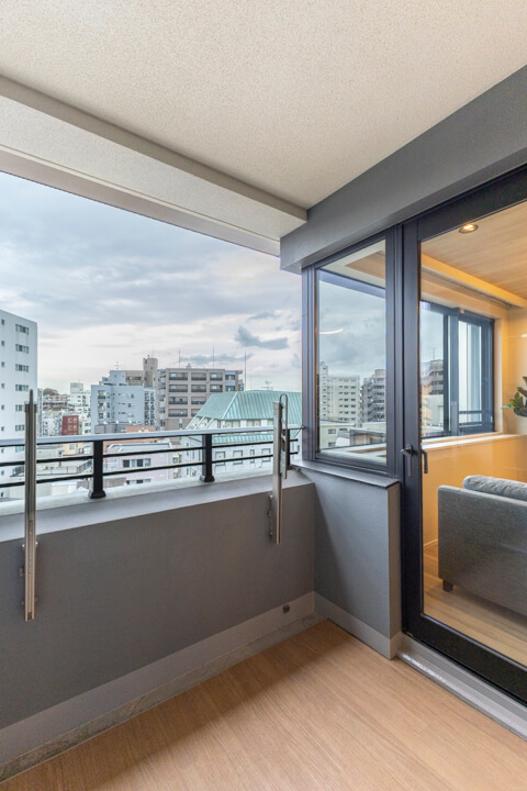 LDKと洋室2に接続するバルコニー。5.75㎡です。撮影日はあいにくのお天気でしたが、東向きのため、晴れの日には心地よい朝日が届きそう。中落合公園を望む、抜けのある眺めが魅力です。