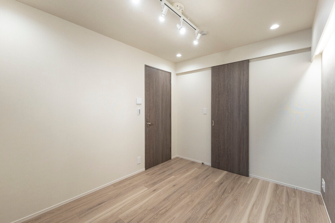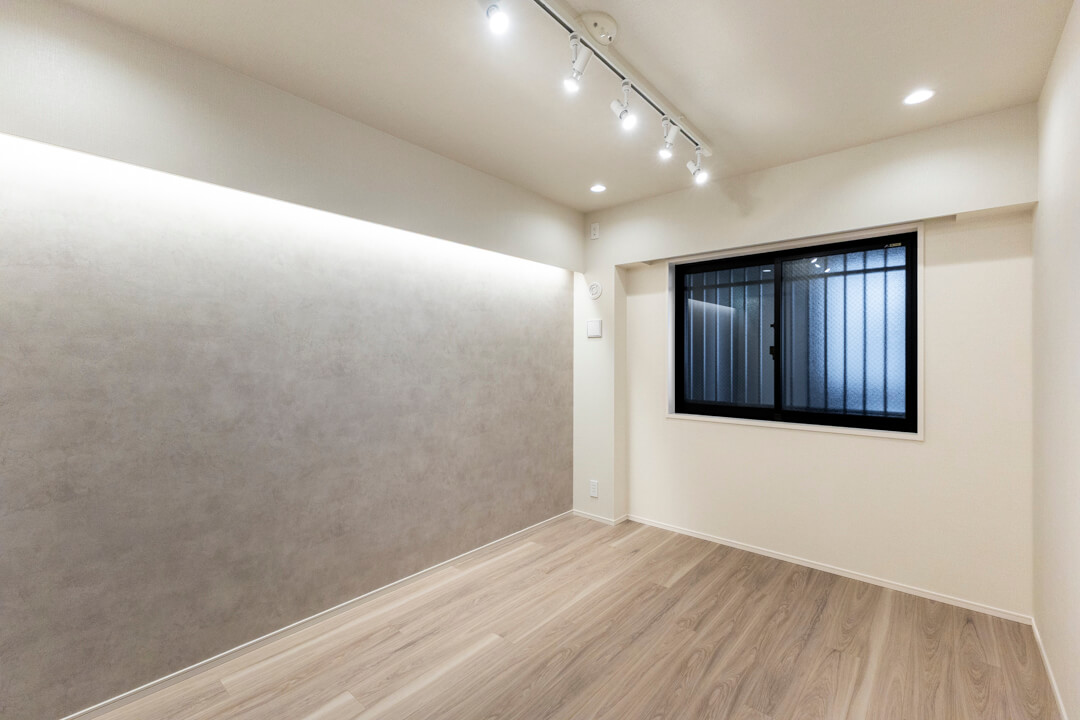 約6.5帖の洋室1。さりげないアクセントウォールに間接照明が施され、落ち着く空間を演出します。リビング同様、床暖房が敷設されていて、寒い時期も足元から快適に。主寝室にぴったりの空間です。