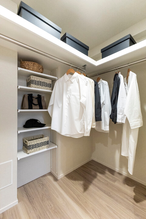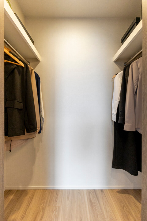 WIC(ウォークインクローゼット)完備で収納力◎。ハンガーパイプと可動棚が設置されていて、荷物を整理整頓しやすいです。トランクケースや季節家電といった大きな荷物も収納でき、居室空間を有効活用できそうですね。