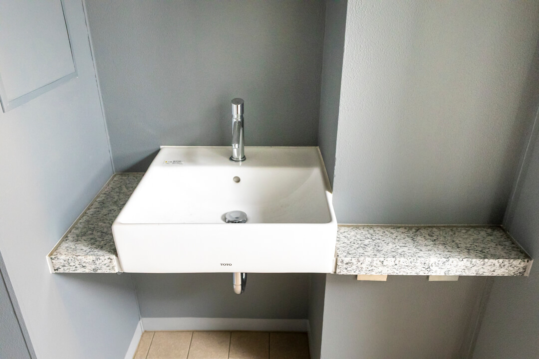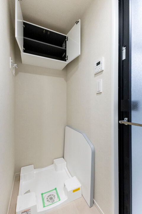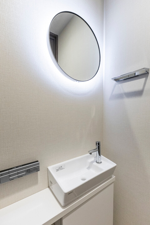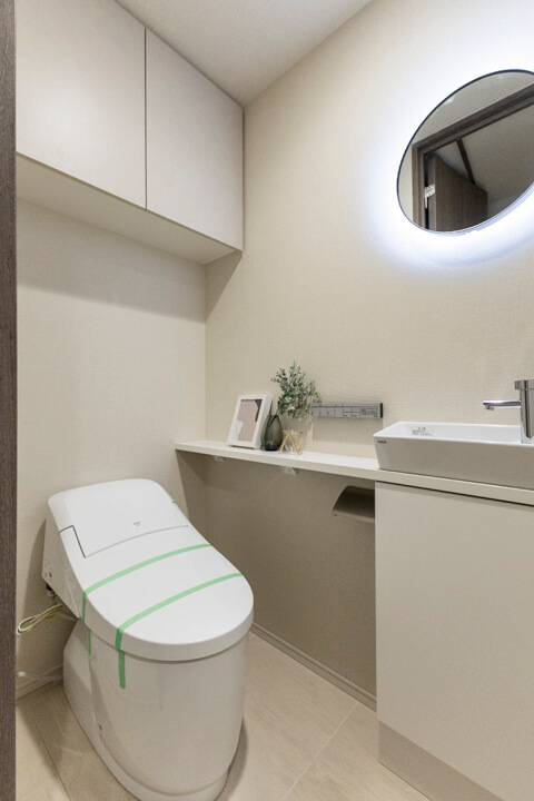 廊下に面していて独立性の高いレストルーム。手洗いカウンター付きなので、すぐに手を洗うことができて衛生的です。丸いミラーが印象的で、さっと身だしなみチェックができるのも嬉しいですね。トイレットペーパーや掃除用品は吊戸棚に収納してください。