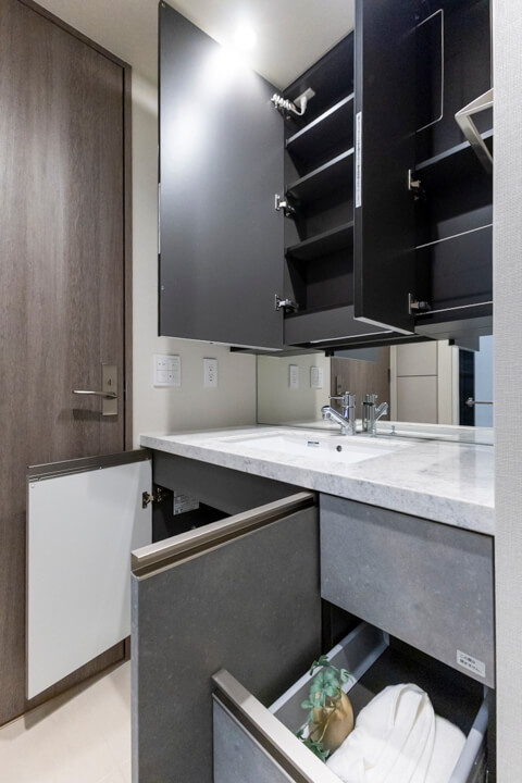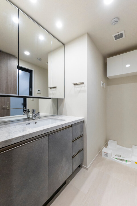 グレートーンでスタイリッシュな洗面化粧台。大きな三面鏡&ミドルミラー付きで身だしなみを整えるのに便利です。カウンタースペースにゆとりがあり、化粧品やドライヤーの仮置きができるのも嬉しいですね。洗面台本体の収納に加え、リネン庫も設置されていて、いつも清潔な洗面室をキープできそうです。