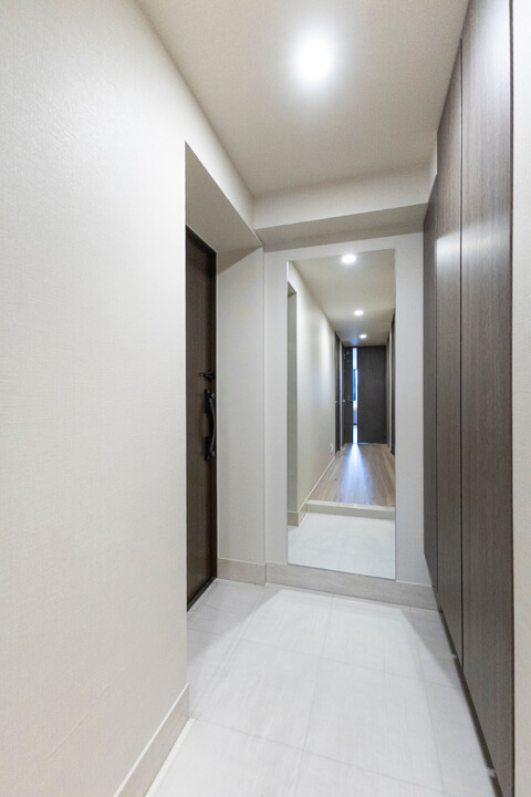 人感センサー搭載でいつも明るく出迎えてくれる玄関。荷物で両手が塞がっている時や夜遅く帰宅した時に、スイッチを探す手間がかからず助かります。入って左手には全身鏡があり、空間に奥行きをもたらします。靴を履いた状態でコーディネートチェックができるのも嬉しいですね。天井まで高さのあるシューズボックスを完備していて、いつも清潔な玄関でお出迎えできそうです。
