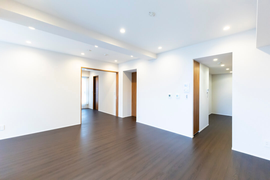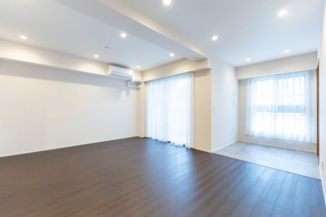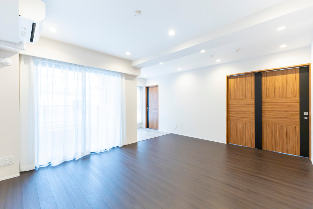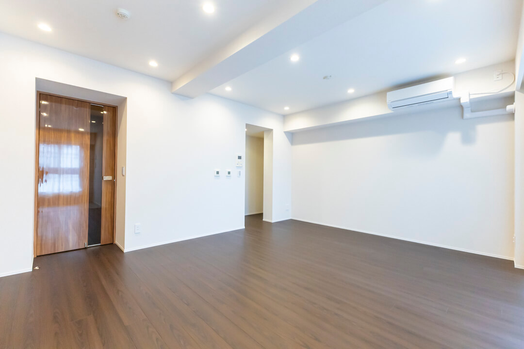 約20帖の広々としたLDK。東向きの窓から明るい朝日が降り注ぎます。フローリングは落ち着いた印象をもたらす木目柄。床暖房が敷設されているので、寒い季節も足元からじんわりと温まることができます。直接火に触れたり、コードに絡まってしまうことがないので、小さなお子さまやペットがいても安心して使用できそうですね。