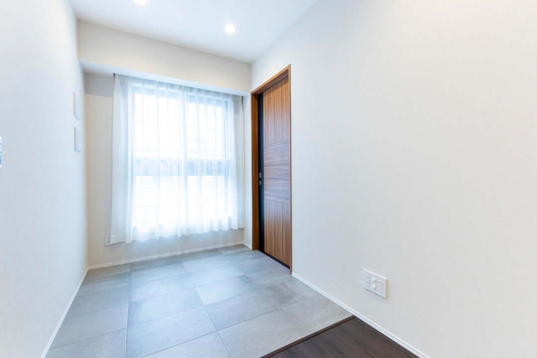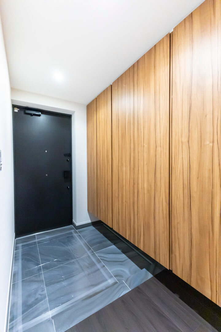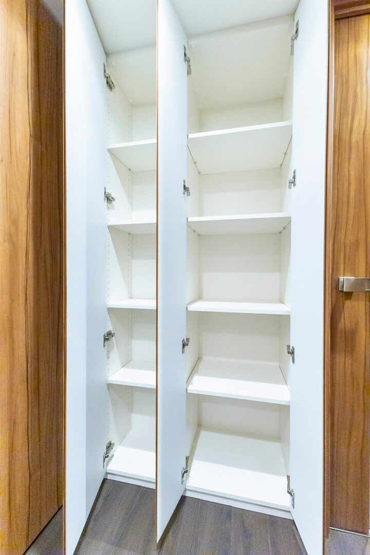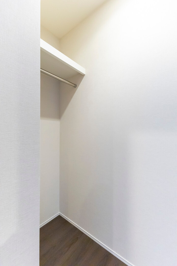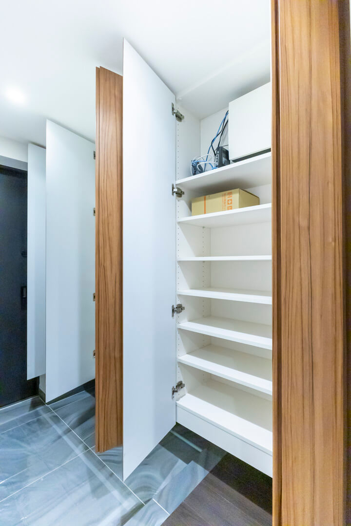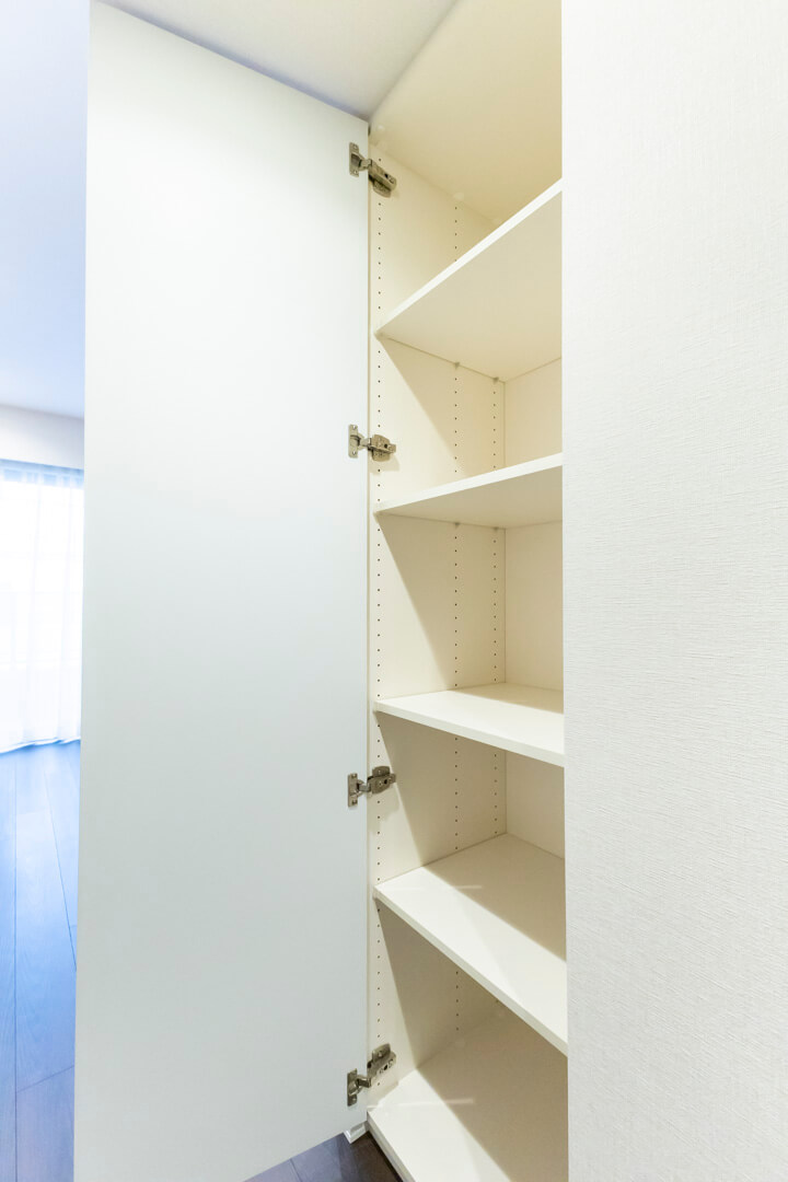 大容量のシューズボックスが並ぶ玄関。自由度の高い可動棚で、散らかりがちな靴をすっきり収納できます。廊下にも物入があり、日用品ストックやペットグッズの収納に重宝しそう。すっきりとした居住空間を実現できそうですね。