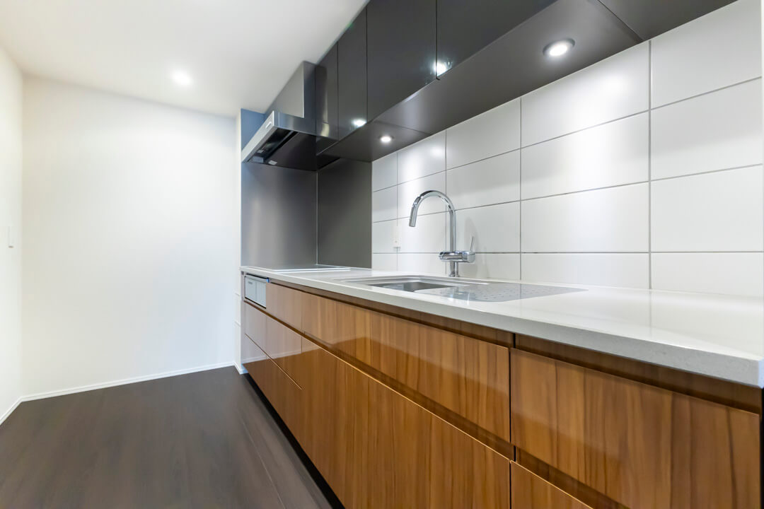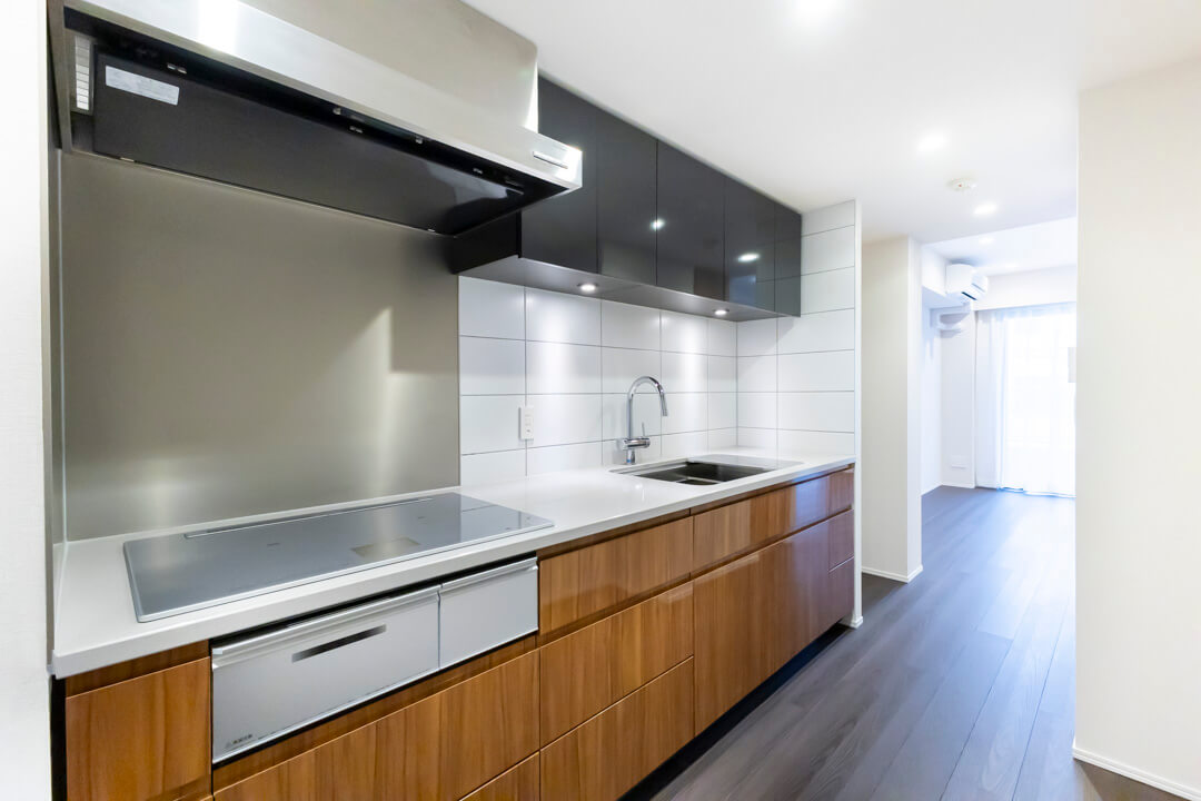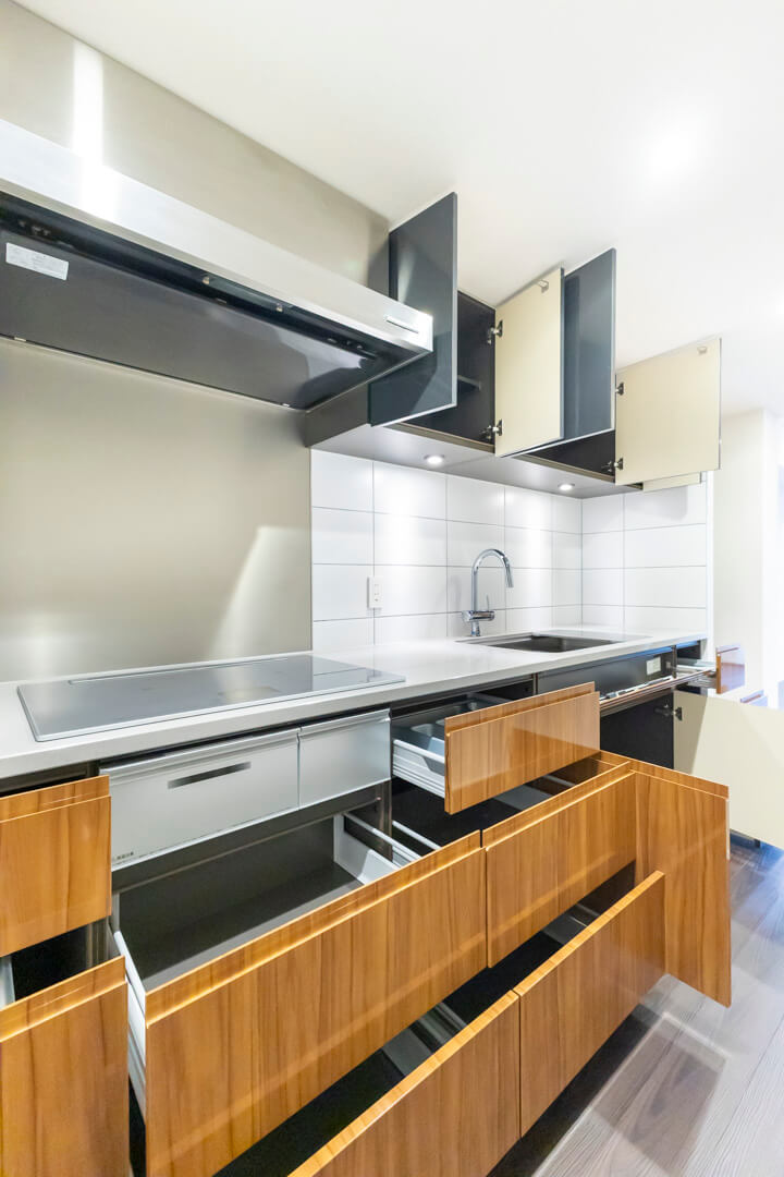 調理に集中できる独立キッチン。生活感が出やすいキッチンまわりをさりげなく目隠しできます。調理中のにおいが生活スペースに広がりにくいのも嬉しいですね。キッチン本体に加え、手前には可動棚があり、豊富な収納も魅力的です。