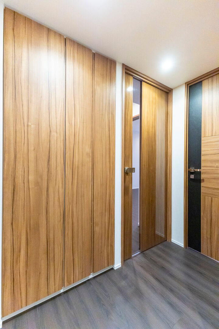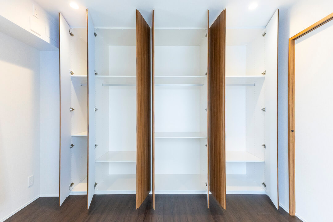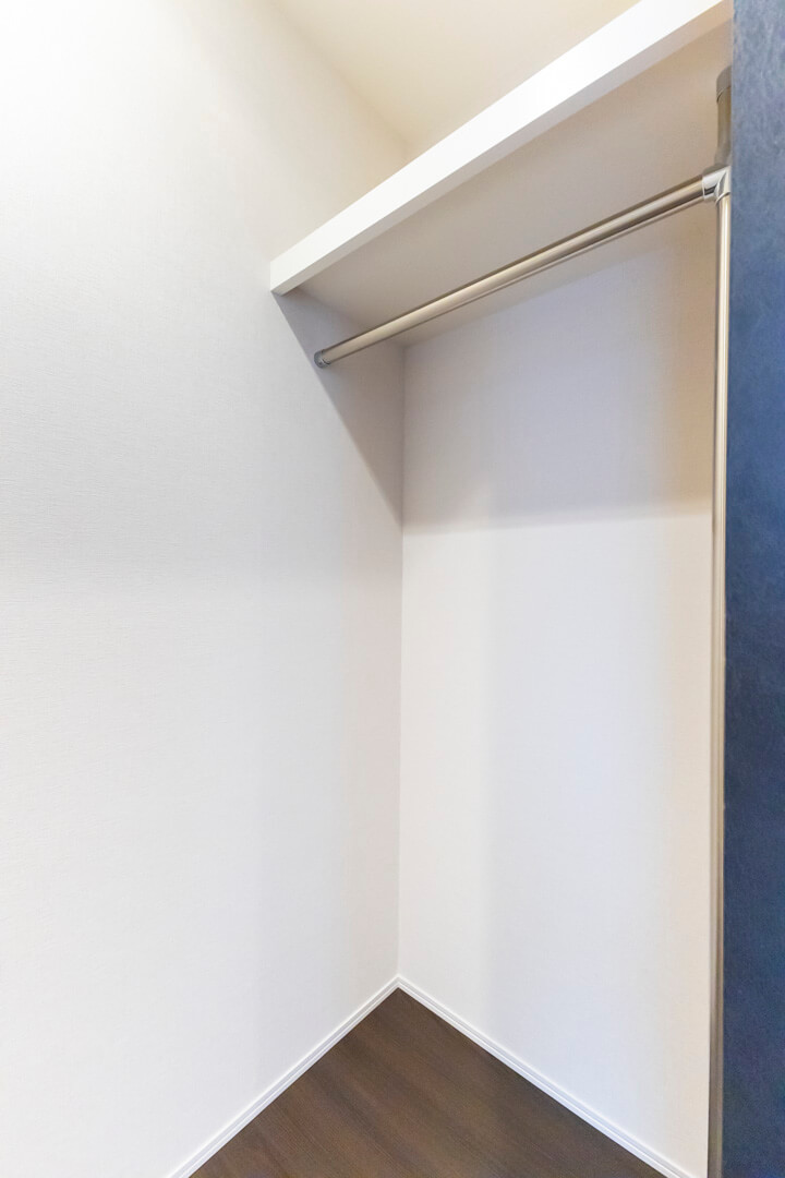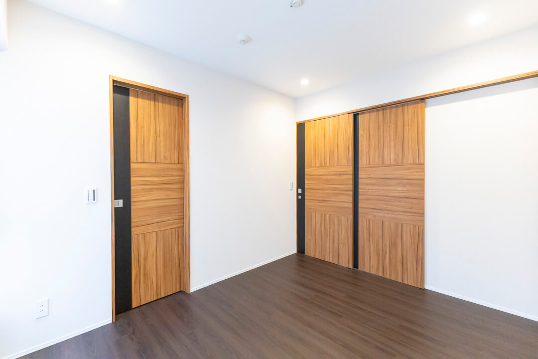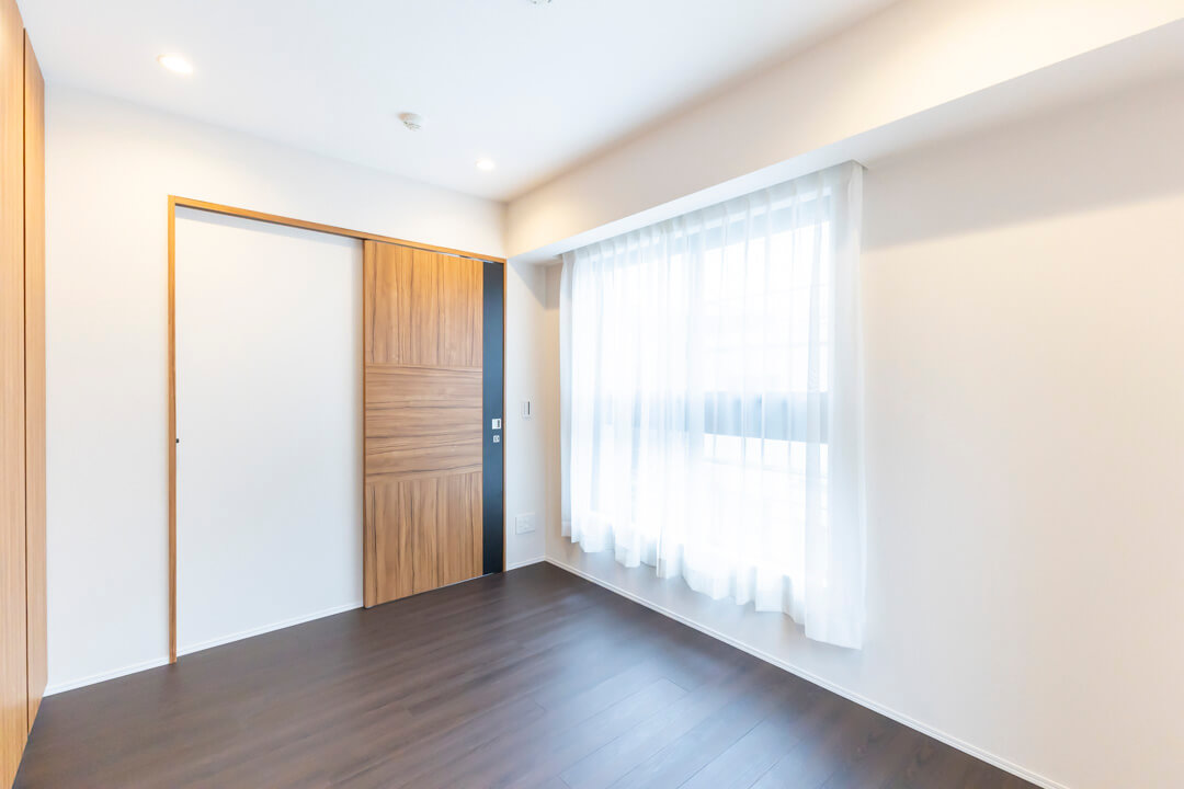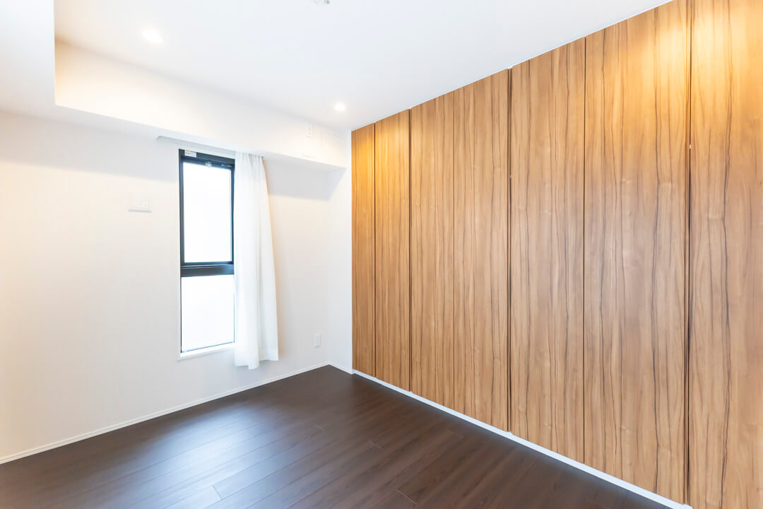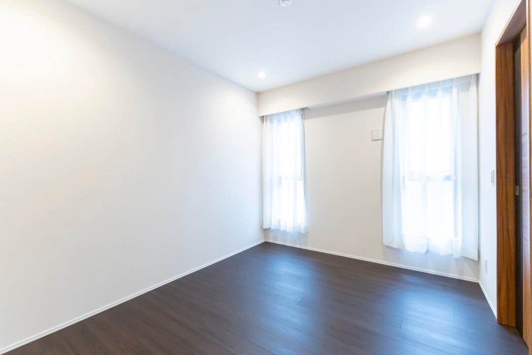 お隣にあるのは約5.7帖の寝室2。南東2面採光で日当たり・風通し良好です。天井まで高さのあるクローゼットが並び、収納スペースも充実◎。寝室としてはもちろん、ワークスペースや趣味部屋としても使い勝手の良い空間です。