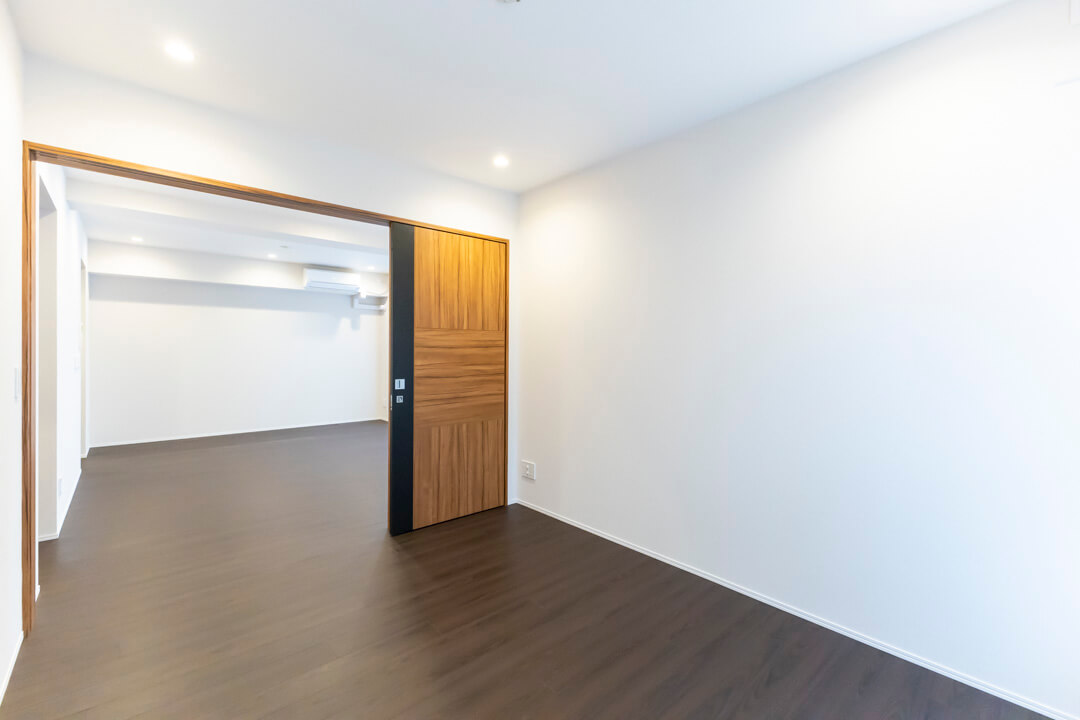 約6帖の寝室1。南向きの窓から明るい光が降り注ぎます。WIC(ウォークインクローゼット)完備で収納性が高く、主寝室にぴったり。LDKとは引き戸で仕切られているので、普段は扉を開けたまま開放的に過ごすのもおすすめです。