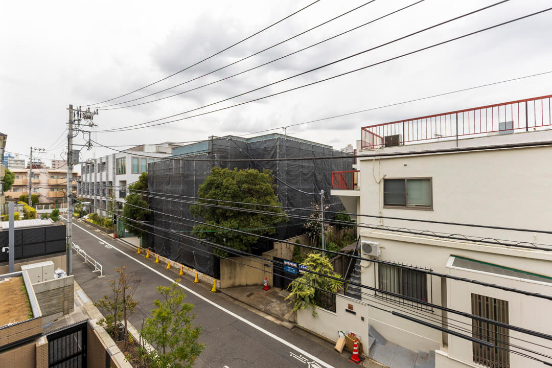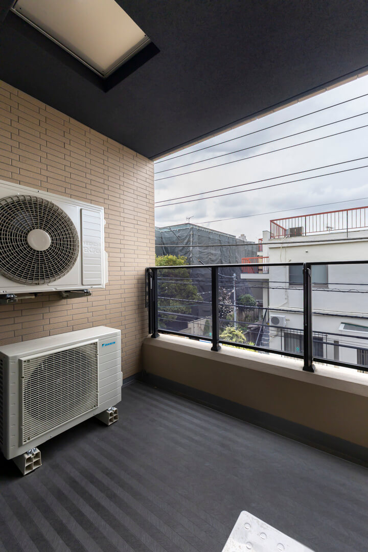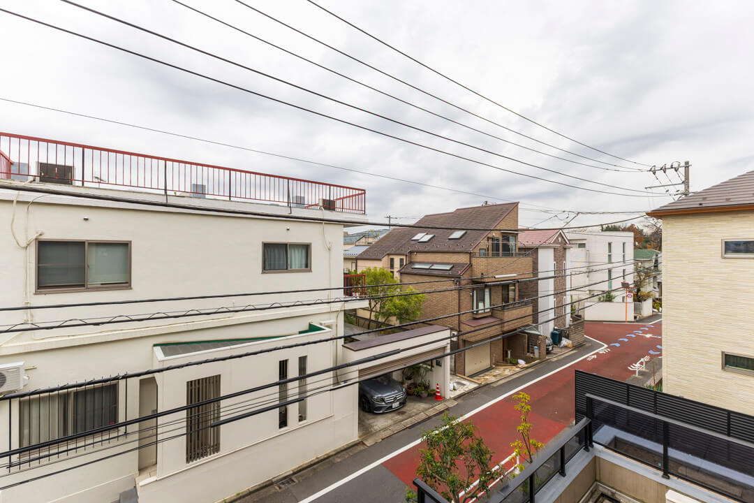 LDKに接続するバルコニー。6.00㎡です。撮影日はあいにくのお天気でしたが、東向きのため、晴れの日には午前中から明るい光が届きそうです。第一種低層住居専用地域に位置しているため、空を見渡せる穏やかな眺めも魅力です。