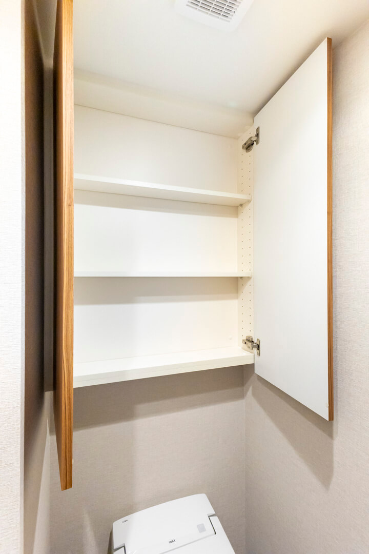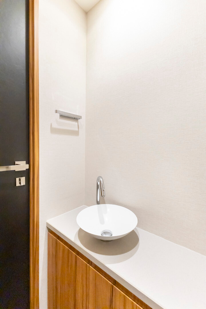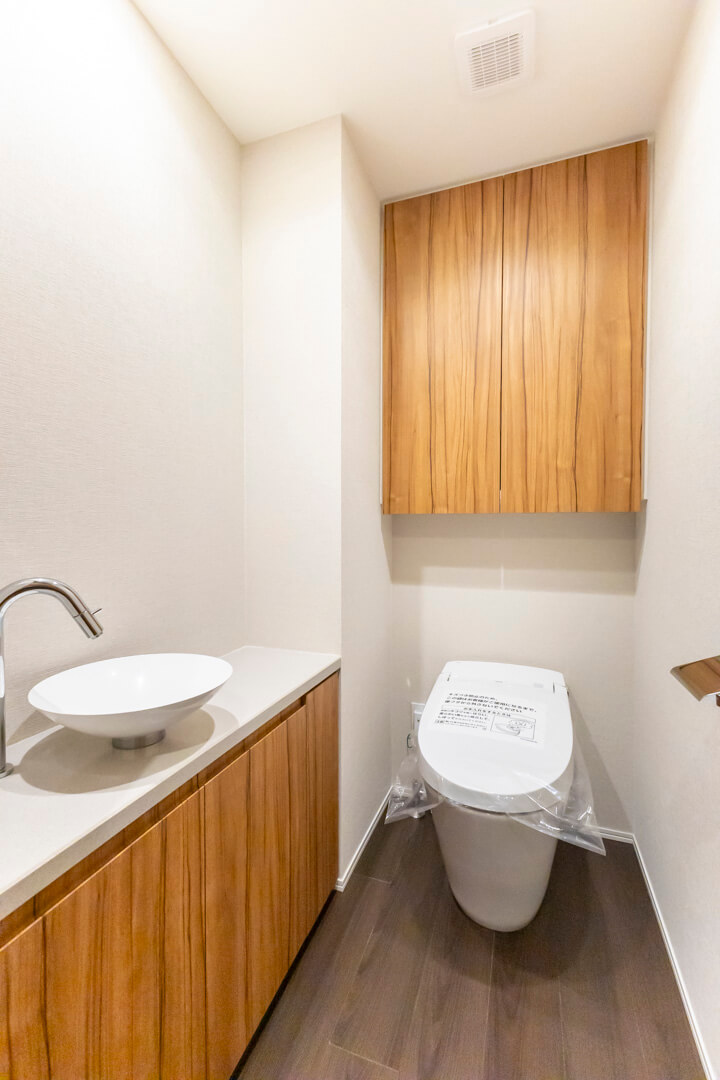 廊下に面していて独立性の高いレストルーム。LIXIL製の洗浄機能付トイレに交換済みです。タンクレス仕様でスタイリッシュ。手洗いカウンター付きなのですぐに手を洗うことができ、ゲストを洗面室まで案内する手間もかかりません。