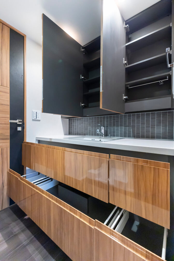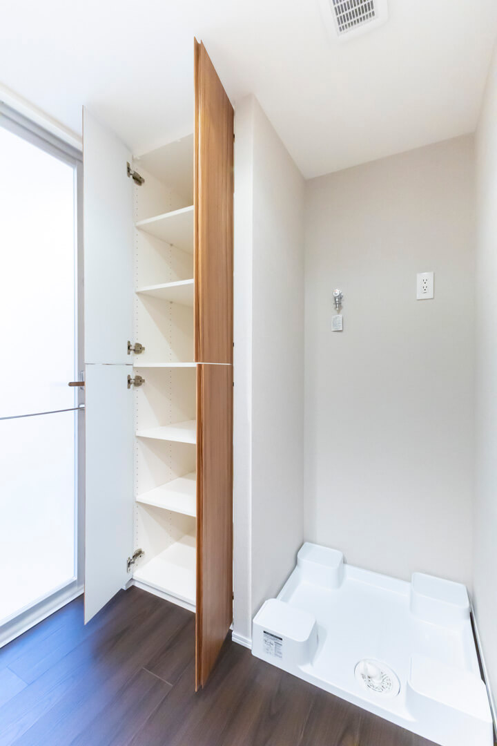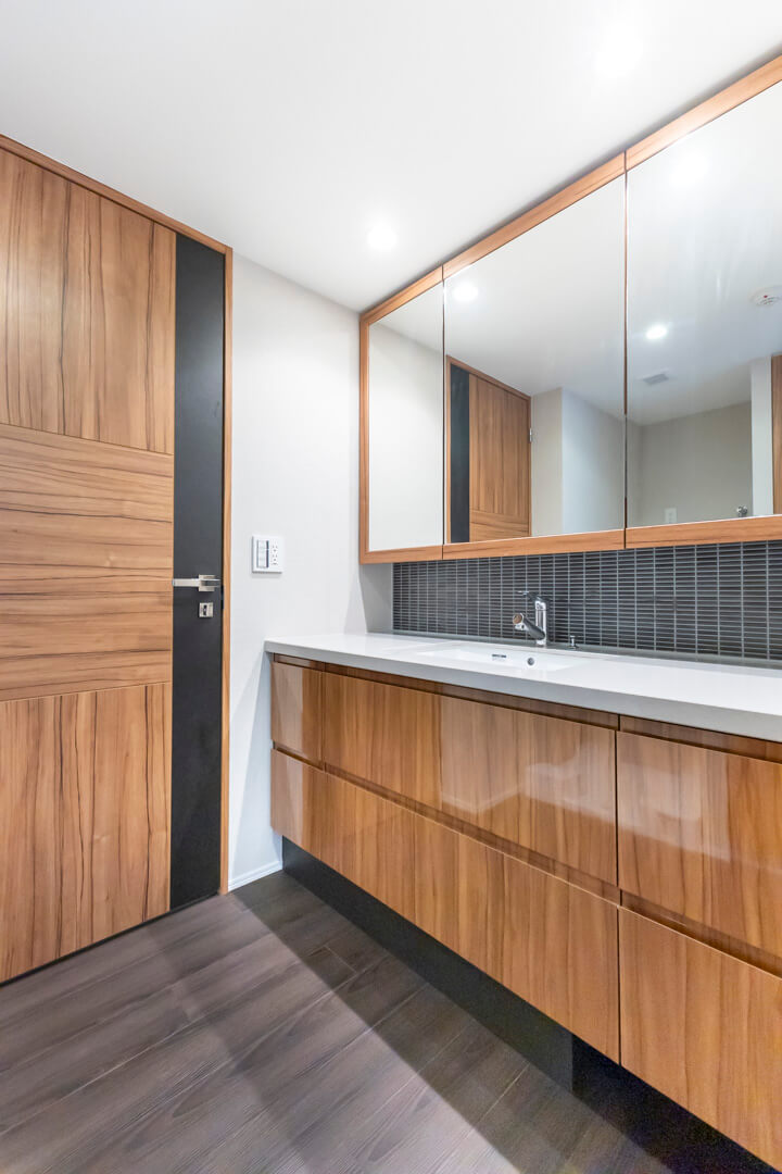 木目デザインが美しく、高級感の漂う洗面化粧台。大きな三面鏡付きで身だしなみを整えるのに便利です。カウンタースペースにはゆとりがあり、化粧品やドライヤーの仮置きが可能。忙しい朝の身支度も落ち着いて行えそうですね。反対側には洗濯機パンとリネン庫を設置。タオルやパジャマ、洗濯用品などをたっぷり収納でき、いつも清潔な洗面室をキープできそうです。