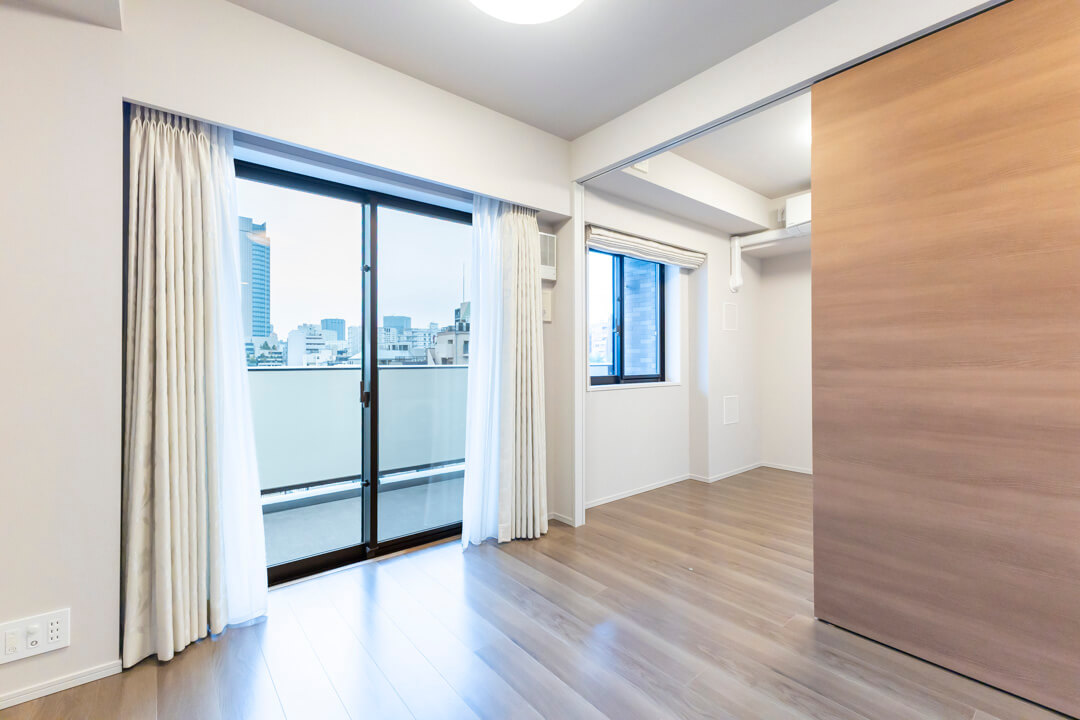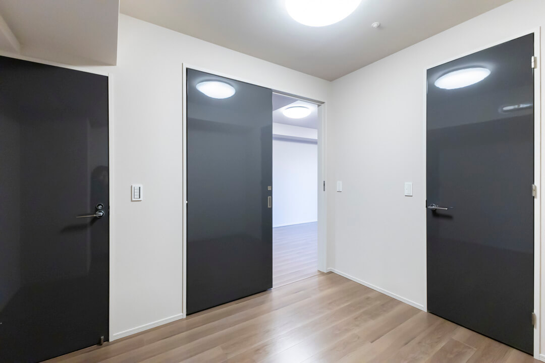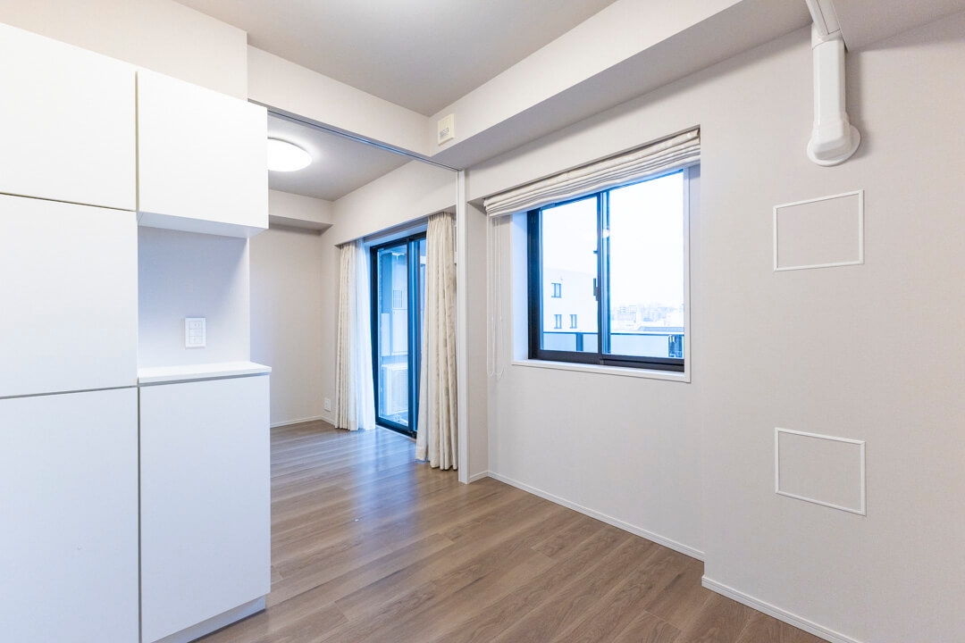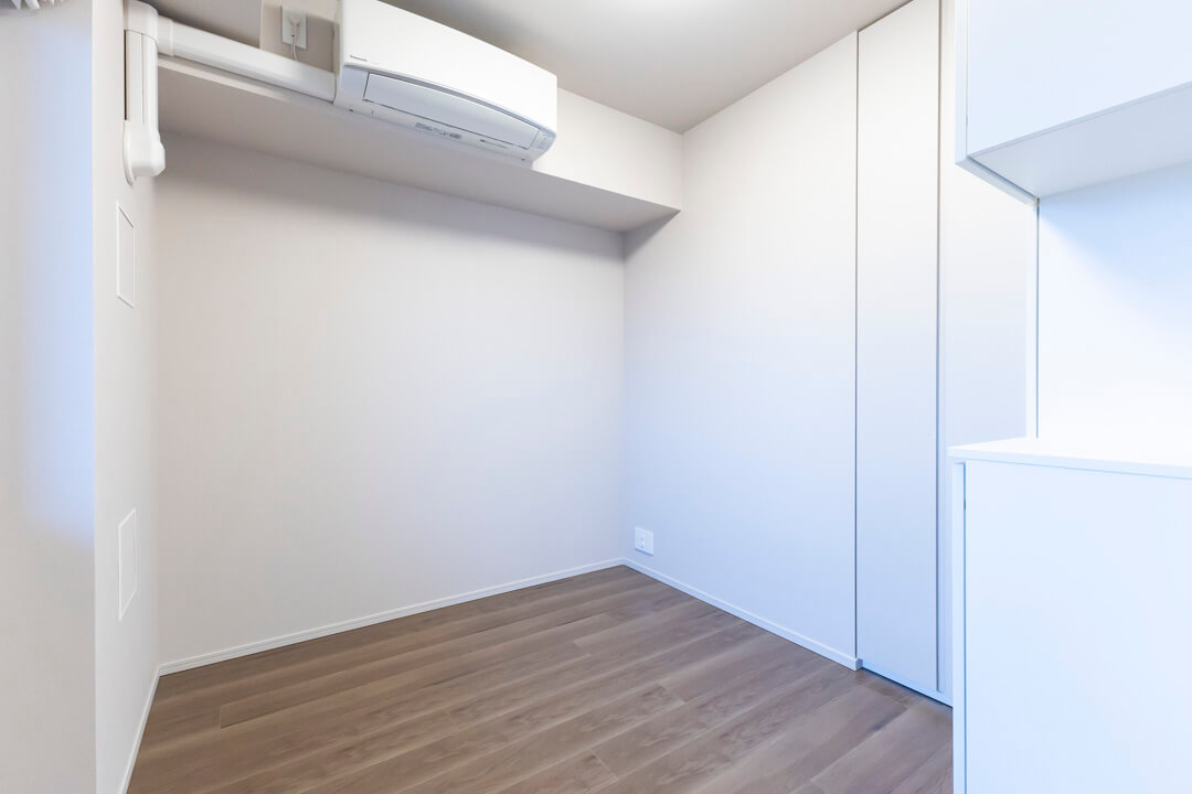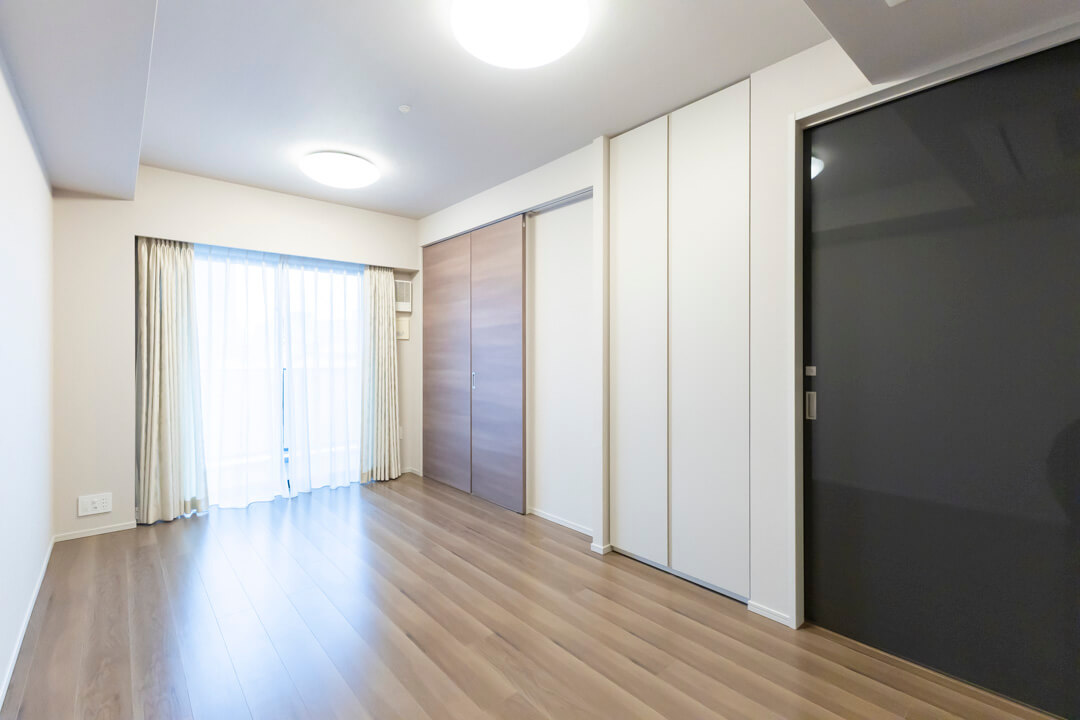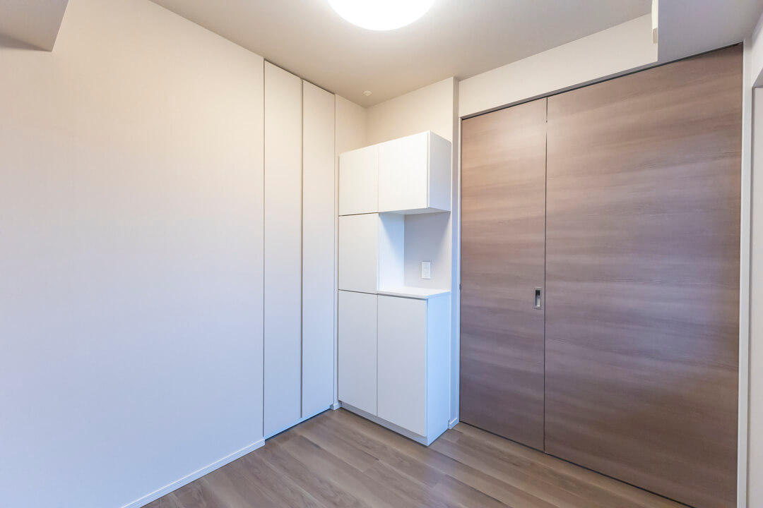 約4.5帖の洋室2。南東向きの窓から明るい光が届きます。クローゼット&棚が備え付けで収納豊富◎。自由度の高い可動棚で、散らかりがちな荷物をすっきり収納できます。LDKとは引き込み戸で仕切られているので、ライフスタイルやシーンに合わせて使い分けると◎。扉を開放して拡張リビングにしたり、閉めてワークスペースやプライベート空間にしたり。フレキシブルに活用してください。