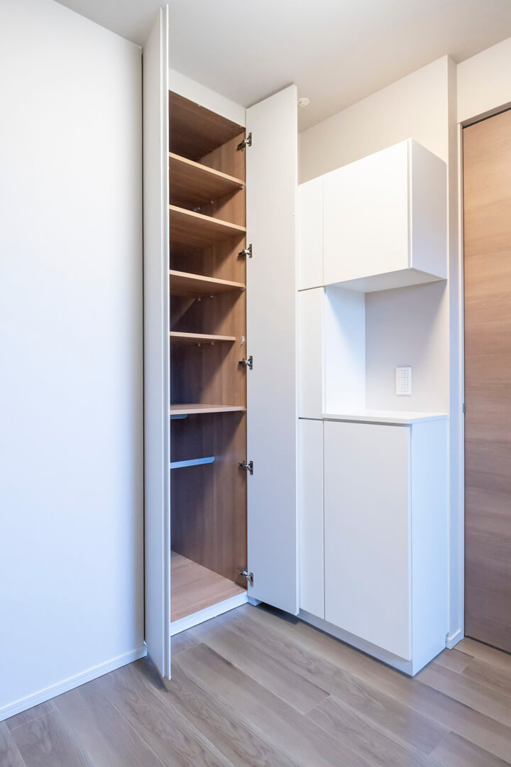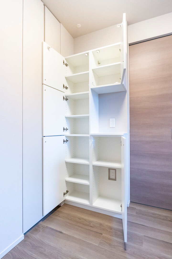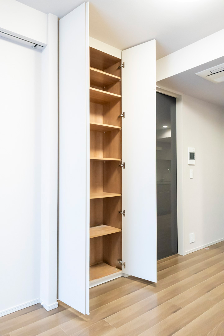 洋室扉の隣には可動棚収納を完備しています。書類や生活小物の収納に重宝しそう。散らかりがちなリビングがすっきり片付きそうです。